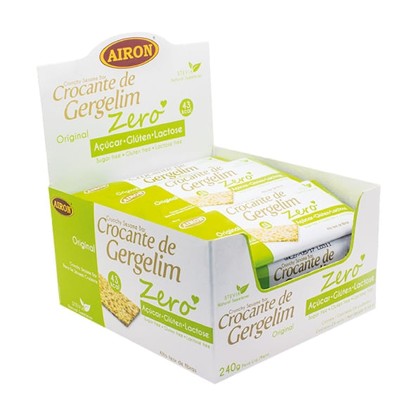 Informações técnicas do produto:<br> O Crocante Gergelim Original, da Airon, é uma barrinha deliciosa, saudável e crocante, feita com gergelim, sem glúten, sem lactose, sem adição de açúcar e adoçado com stevia. Uma opção nutritiva, com a praticidade das embalagens individuais para consumir a qualquer hora do dia.<br> <br> Recomendações de consumo:<br> Ideal para ser consumido a qualquer hora do dia. Recomendado para indivíduos com intolerância a lactose e celíacos<br> <br> Informações sobre alergênicos:<br> Pode conter traços de castanha de caju.<br> <br> Por que escolher esse produto?<br> Crocante<br> Isento de glúten<br> Zero açúcar<br> Sem lactose<br> Adoçado com Stevia<br> Alto teor de fibras<br> Contém somente 43kcal por unidade<br> Sobre a marca:<br> A Airon começou quando a Família Ferro, por ter restrição médica ao consumo de açúcar, atiçou a vontade de criar doces saudáveis que fossem saborosos tanto quanto de sua infância. Atualmente a empresa vem crescendo sempre levando a mesa alimentos saudáveis, todos zero açúcar, zero glúten e zero lactose.