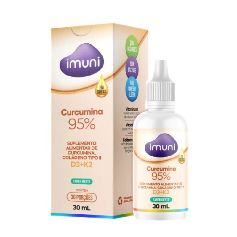 <h2><strong>CURCUMINA 95% 30ML IMUNI</strong></h2> <p>O suplemento <strong>Imuni</strong> <strong>Curcumina 95% </strong>da <strong>Cromo Florais</strong> é formulado com extrato de cúrcuma longa, colágeno tipo ll e vitaminas D3 e K2. Possui sabor de menta e é sem glúten, lactose e adição de açúcar. Sua apresentação líquida permite fácil ingestão e promove maior absorção. Ideal para quem não se adapta a ingestão de cápsulas ou comprimidos.</p> <h3><strong>Sobre os ingredientes:</strong></h3> <p><strong>Cúrcuma:</strong> raiz de uma planta da família do gengibre que é fonte de <strong>curcumina</strong>, principal ativo antioxidante encontrado na cúrcuma, possui ação anti-inflamatória e pode contribuir no reforço do sistema imune, prevenindo gripes e resfriados;</p> <p><strong>Colágeno tipo II </strong>pode atuar na saúde das articulações;</p> <p>A <strong>vitamina D3</strong> auxilia na saúde óssea e funcionamento muscular;</p> <h3><strong>Sugestão de consumo:</strong></h3> <p>Recomenda-se a ingestão de 20 gotas 1 vez ao dia ou conforme recomendação de um profissional de saúde.</p> <h3><strong>Motivos para escolher o produto:</strong></h3> <ul> <li>Ideal para quem tem dificuldades em ingerir cápsulas;</li> <li>Prático para consumo</li> <li>Rápida absorção;</li> <li>Sem glúten e lactose;</li> </ul> <h3><strong>A Marca</strong></h3> <p>A<strong> Cromo Florais</strong> é uma empresa brasileira voltada para o segmento de essências florais e suplementos nutricionais para a promoção da saúde. Desenvolve produtos naturais que são utilizados em terapia complementar, auxiliando o corpo a encontrar seu caminho para o bem-estar natural.</p>