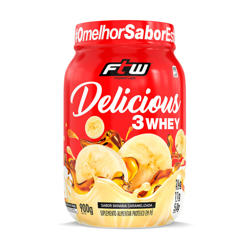 <p>O <strong>Delicious 3 Whey sabor banana caramelizada FTW</strong> combina nutrição e sabor em uma fórmula exclusiva. Com um <strong>blend de proteínas do soro do leite — concentrada, isolada e hidrolisada</strong> — entrega <strong>24 g de proteína por porção</strong>, além de ser <strong>rico em BCAA e glutamina</strong>. Sua fórmula foi especialmente desenvolvida para oferecer <strong>alta qualidade nutricional</strong> e <strong>sabores únicos que só a FTW tem</strong>. Uma combinação surpreendente para quem quer variar sem abrir mão da performance.</p> <h2>Sugestão de consumo</h2> <p>Recomenda-se diluir <strong>2 medidas dosadoras (40 g)</strong> do produto em aproximadamente <strong>200 ml (1 copo) de água gelada</strong>. Consumir após a atividade física, nos lanches intermediários ou conforme recomendação do nutricionista ou médico.</p> <h2>Motivos para escolher o produto</h2> <ul> <li>Whey 3W</li> <li>Fornece 24 g de proteína por porção</li> <li>Fonte de BCAA e glutamina</li> <li>Sabor gourmet</li> <li>Sem adição de açúcares</li> <li>Sem glúten</li> </ul> <h2>A marca</h2> <p>A <strong>FTW</strong> nasceu do espírito <em>For The Win</em>, com a missão de oferecer suplementos de alta qualidade para quem leva o esporte a sério. Mais do que atender às demandas do desempenho físico, a marca <strong>inspira atletas de todos os níveis a superarem seus próprios limites</strong>, com produtos desenvolvidos para potencializar resultados.</p> <p>Com uma linha completa e rigorosamente testada, a FTW está presente na rotina de quem busca <strong>evolução constante</strong>. Cada fórmula carrega o <strong>compromisso com a performance, a saúde e a superação</strong>.</p>