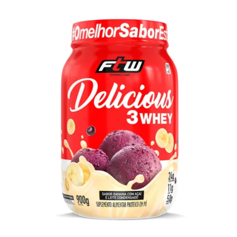 <p>O <strong>Delicious 3 Whey sabor Banana com Açaí e Leite Condensado FTW</strong> combina nutrição e sabor em uma fórmula exclusiva. Com um <strong>blend de proteínas do soro do leite — concentrada, isolada e hidrolisada</strong> — entrega <strong>24 g de proteína por porção</strong>, além de ser <strong>rico em BCAA e glutamina</strong>. Sua fórmula foi especialmente desenvolvida para oferecer alta qualidade nutricional e <strong>sabores únicos que só a FTW tem</strong>. Uma combinação surpreendente para quem quer variar no shake sem abrir mão da performance.</p> <h2>Sugestão de consumo</h2> <p>Recomenda-se diluir <strong>2 medidas dosadoras (40 g)</strong> do produto em aproximadamente <strong>200 ml (1 copo) de água gelada</strong>. Consumir após a atividade física, nos lanches intermediários ou conforme recomendação do nutricionista ou médico.</p> <h2>Motivos para escolher o produto</h2> <ul> <li>Whey 3W</li> <li>Fornece 24 g de proteína por porção</li> <li>Fonte de BCAA e glutamina</li> <li>Sabor gourmet</li> <li>Sem adição de açúcares</li> <li>Sem glúten</li> </ul> <h2>A marca</h2> <p>A <strong>FTW</strong> nasceu do espírito <em>For The Win</em>, com a missão de oferecer suplementos de alta qualidade para quem leva o esporte a sério. Mais do que atender às demandas do desempenho físico, a marca <strong>inspira atletas de todos os níveis a superarem seus próprios limites</strong>, com produtos desenvolvidos para potencializar resultados.</p> <p>Com uma linha completa e rigorosamente testada, a FTW está presente na rotina de quem busca <strong>evolução constante</strong>. Cada fórmula carrega o <strong>compromisso com a performance, a saúde e a superação</strong>.</p>