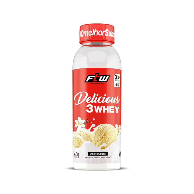<p><span>O </span><b>Delicious 3 Whey sabor Chantilly com Morango FTW</b><span> combina nutrição e sabor em uma fórmula exclusiva. Com um blend de proteínas do soro do leite — concentrada, isolada e hidrolisada — entrega 24 g de proteína por porção, além de ser rico em BCAA e glutamina. Sua fórmula foi especialmente desenvolvida para oferecer alta qualidade nutricional e sabores únicos que só a FTW tem. Uma combinação surpreendente para quem quer variar sem abrir mão da performance. Nesta embalagem individual é prático para transporte e preparo.</span></p> <h2><b>Sugestão de consumo: </b></h2> <p><span>Completar o conteúdo da garrafinha com água gelada. Consumir após a atividade física, nos lanches intermediários ou conforme recomendação do nutricionista ou médico.</span></p> <h2><b>Motivos para escolher o produto: </b></h2> <ul> <li aria-level="1"><span>Whey 3W;</span></li> <li aria-level="1"><span>Fornece 24 g de proteína por porção;</span></li> <li aria-level="1"><span>Fonte de BCAA e glutamina;</span></li> <li aria-level="1"><span>Sabor gourmet;</span></li> <li aria-level="1"><span>Prático para transporte e preparo;</span></li> <li aria-level="1"><span>Sem adição de açúcares;</span></li> <li aria-level="1"><span>Sem glúten.</span></li> </ul> <h2><b>A marca:</b></h2> <p><span>A </span><b>FTW</b><span> nasceu do espírito </span><i><span>For The Win</span></i><span>, com a missão de oferecer suplementos de alta qualidade para quem leva o esporte a sério. Mais do que atender às demandas do desempenho físico, a marca inspira atletas de todos os níveis a superarem seus próprios limites, com produtos desenvolvidos para potencializar resultados. Com uma linha completa e rigorosamente testada, a FTW está presente na rotina de quem busca evolução constante. Cada fórmula carrega o compromisso com a performance, a saúde e a superação.</span></p>