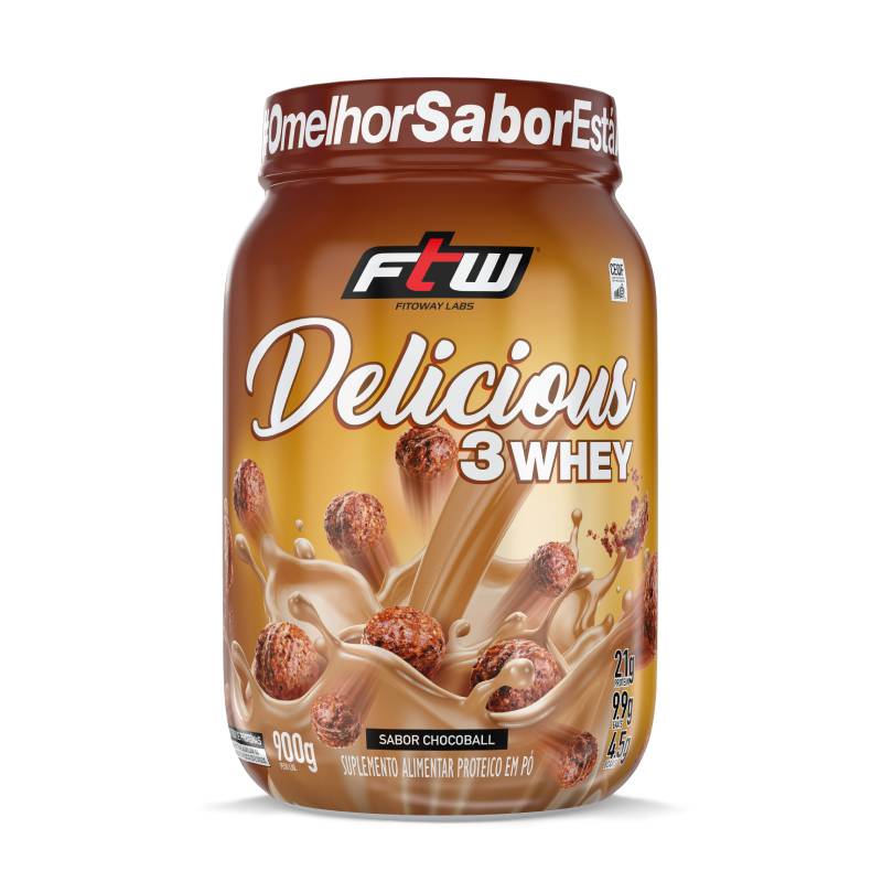 <p>O <strong>Delicious 3 Whey sabor Chocoball FTW</strong> combina nutrição e sabor em uma fórmula exclusiva. Com um <strong>blend de proteínas do soro do leite — concentrada, isolada e hidrolisada</strong> — entrega <strong>24 g de proteína por porção</strong>, além de ser <strong>rico em BCAA e glutamina</strong>. Sua fórmula foi especialmente desenvolvida para oferecer <strong>alta qualidade nutricional</strong> e <strong>sabores únicos que só a FTW tem</strong>. Uma combinação surpreendente para quem quer variar sem abrir mão da performance.</p> <h2>Sugestão de consumo</h2> <p>Recomenda-se diluir <strong>2 medidas dosadoras (40 g)</strong> do produto em aproximadamente <strong>200 ml (1 copo) de água gelada</strong>. Consumir após a atividade física, nos lanches intermediários ou conforme recomendação do nutricionista ou médico.</p> <h2>Motivos para escolher o produto</h2> <ul> <li>Whey 3W</li> <li>Fornece 24 g de proteína por porção</li> <li>Fonte de BCAA e glutamina</li> <li>Sabor gourmet</li> <li>Sem adição de açúcares</li> <li>Sem glúten</li> </ul> <h2>A marca</h2> <p>A <strong>FTW</strong> nasceu do espírito <em>For The Win</em>, com a missão de oferecer suplementos de alta qualidade para quem leva o esporte a sério. Mais do que atender às demandas do desempenho físico, a marca <strong>inspira atletas de todos os níveis a superarem seus próprios limites</strong>, com produtos desenvolvidos para potencializar resultados.</p> <p>Com uma linha completa e rigorosamente testada, a FTW está presente na rotina de quem busca <strong>evolução constante</strong>. Cada fórmula carrega o <strong>compromisso com a performance, a saúde e a superação</strong>.</p>