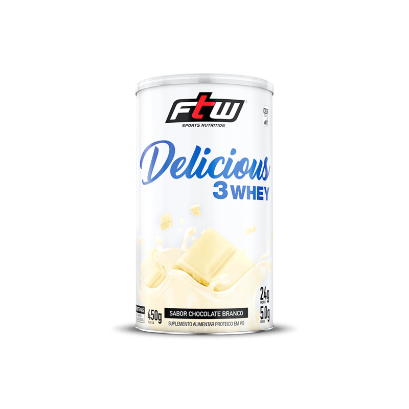 <p><span>O </span><b>Delicious 3 Whey sabor chocolate branco FTW</b><span> combina nutrição e sabor em uma fórmula exclusiva. Com um blend de proteínas do soro do leite — concentrada, isolada e hidrolisada — entrega 24 g de proteína por porção, além de ser rico em BCAA e glutamina. Sua fórmula foi especialmente desenvolvida para oferecer alta qualidade nutricional e sabores únicos que só a FTW tem. Uma combinação surpreendente para quem quer variar sem abrir mão da performance.</span></p> <h2><b>Sugestão de consumo: </b></h2> <p><span>Recomenda-se diluir 2 medidas dosadoras (40 g) do produto em aproximadamente 200 ml (1 copo) de água gelada. Consumir após a atividade física, nos lanches intermediários ou conforme recomendação do nutricionista ou médico.</span></p> <h2><b>Motivos para escolher o produto: </b></h2> <ul> <li aria-level="1"><span>Whey 3W;</span></li> <li aria-level="1"><span>Fornece 24 g de proteína por porção;</span></li> <li aria-level="1"><span>Fonte de BCAA e glutamina;</span></li> <li aria-level="1"><span>Sabor gourmet;</span></li> <li aria-level="1"><span>Sem adição de açúcares;</span></li> <li aria-level="1"><span>Sem glúten.</span></li> </ul> <h2><b>A marca:</b></h2> <p><span>A </span><b>FTW</b><span> nasceu do espírito </span><i><span>For The Win</span></i><span>, com a missão de oferecer suplementos de alta qualidade para quem leva o esporte a sério. Mais do que atender às demandas do desempenho físico, a marca inspira atletas de todos os níveis a superarem seus próprios limites, com produtos desenvolvidos para potencializar resultados. Com uma linha completa e rigorosamente testada, a FTW está presente na rotina de quem busca evolução constante. Cada fórmula carrega o compromisso com a performance, a saúde e a superação.</span></p>