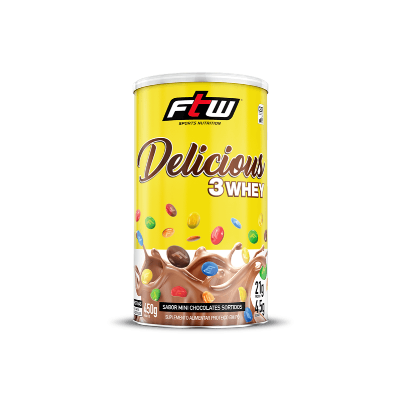 <p><span>O </span><b>Delicious 3 Whey sabor chocolates sortidos FTW</b><span> combina nutrição e sabor em uma fórmula exclusiva. Com um blend de proteínas do soro do leite — concentrada, isolada e hidrolisada — entrega 24 g de proteína por porção, além de ser rico em BCAA e glutamina. Sua fórmula foi especialmente desenvolvida para oferecer alta qualidade nutricional e sabores únicos que só a FTW tem. Uma combinação surpreendente para quem quer variar sem abrir mão da performance.</span></p> <h2><b>Sugestão de consumo: </b></h2> <p><span>Recomenda-se diluir 2 medidas dosadoras (40 g) do produto em aproximadamente 200 ml (1 copo) de água gelada. Consumir após a atividade física, nos lanches intermediários ou conforme recomendação do nutricionista ou médico.</span></p> <h2><b>Motivos para escolher o produto: </b></h2> <ul> <li aria-level="1"><span>Whey 3W;</span></li> <li aria-level="1"><span>Fornece 24 g de proteína por porção;</span></li> <li aria-level="1"><span>Fonte de BCAA e glutamina;</span></li> <li aria-level="1"><span>Sabor gourmet;</span></li> <li aria-level="1"><span>Sem adição de açúcares;</span></li> <li aria-level="1"><span>Sem glúten.</span></li> </ul> <h2><b>A marca:</b></h2> <p><span>A </span><b>FTW</b><span> nasceu do espírito </span><i><span>For The Win</span></i><span>, com a missão de oferecer suplementos de alta qualidade para quem leva o esporte a sério. Mais do que atender às demandas do desempenho físico, a marca inspira atletas de todos os níveis a superarem seus próprios limites, com produtos desenvolvidos para potencializar resultados. Com uma linha completa e rigorosamente testada, a FTW está presente na rotina de quem busca evolução constante. Cada fórmula carrega o compromisso com a performance, a saúde e a superação.</span></p>