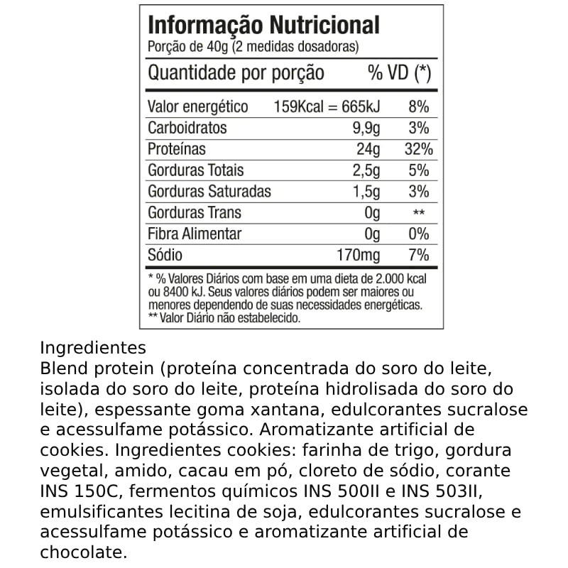 <p><span>O </span><b>Delicious 3 Whey sabor cookies FTW</b><span> combina nutrição e sabor em uma fórmula exclusiva. Com um blend de proteínas do soro do leite — concentrada, isolada e hidrolisada — entrega 24 g de proteína por porção, além de ser rico em BCAA e glutamina. Sua fórmula foi especialmente desenvolvida para oferecer alta qualidade nutricional e sabores únicos que só a FTW tem. Uma combinação surpreendente para quem quer variar sem abrir mão da performance.</span></p> <h2><b>Sugestão de consumo: </b></h2> <p><span>Recomenda-se diluir 2 medidas dosadoras (40 g) do produto em aproximadamente 200 ml (1 copo) de água gelada. Consumir após a atividade física, nos lanches intermediários ou conforme recomendação do nutricionista ou médico.</span></p> <h2><b>Motivos para escolher o produto: </b></h2> <ul> <li aria-level="1"><span>Whey 3W;</span></li> <li aria-level="1"><span>Fornece 24 g de proteína por porção;</span></li> <li aria-level="1"><span>Fonte de BCAA e glutamina;</span></li> <li aria-level="1"><span>Sabor gourmet;</span></li> <li aria-level="1"><span>Sem adição de açúcares.</span></li> </ul> <h2><b>A marca:</b></h2> <p><span>A </span><b>FTW</b><span> nasceu do espírito </span><i><span>For The Win</span></i><span>, com a missão de oferecer suplementos de alta qualidade para quem leva o esporte a sério. Mais do que atender às demandas do desempenho físico, a marca inspira atletas de todos os níveis a superarem seus próprios limites, com produtos desenvolvidos para potencializar resultados. Com uma linha completa e rigorosamente testada, a FTW está presente na rotina de quem busca evolução constante. Cada fórmula carrega o compromisso com a performance, a saúde e a superação.</span></p>