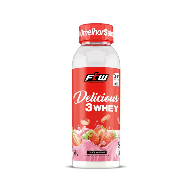 <p><span>O </span><b>Delicious 3 Whey sabor morango FTW</b><span> combina nutrição e sabor em uma fórmula exclusiva. Com um blend de proteínas do soro do leite — concentrada, isolada e hidrolisada — entrega <strong>24 g de proteína</strong> por porção, além de ser rico em BCAA e glutamina. ,</span></p> <p><span>Sua fórmula foi especialmente desenvolvida para oferecer alta qualidade nutricional e sabores únicos que só a FTW tem. Uma combinação surpreendente para quem quer variar sem abrir mão da performance. Nesta embalagem individual é prático para transporte e preparo.</span></p> <h2><b>Sugestão de consumo: </b></h2> <p><span>Completar o conteúdo da garrafinha com água gelada. Consumir após a atividade física, nos lanches intermediários ou conforme recomendação do nutricionista ou médico.</span></p> <h2><b>Motivos para escolher o produto: </b></h2> <ul> <li aria-level="1"><span>Whey 3W</span></li> <li aria-level="1"><span>Fornece 24 g de proteína por porção</span></li> <li aria-level="1"><span>Fonte de BCAA e glutamina</span></li> <li aria-level="1"><span>Sabor gourmet</span></li> <li aria-level="1"><span>Prático para transporte e preparo</span></li> <li aria-level="1"><span>Sem adição de açúcares</span></li> </ul> <h2><b>A marca:</b></h2> <p><span>A </span><b>FTW</b><span> nasceu do espírito </span><i><span>For The Win</span></i><span>, com a missão de oferecer suplementos de alta qualidade para quem leva o esporte a sério. Mais do que atender às demandas do desempenho físico, a marca inspira atletas de todos os níveis a superarem seus próprios limites, com produtos desenvolvidos para potencializar resultados. Com uma linha completa e rigorosamente testada, a FTW está presente na rotina de quem busca evolução constante. Cada fórmula carrega o compromisso com a performance, a saúde e a superação.</span></p>