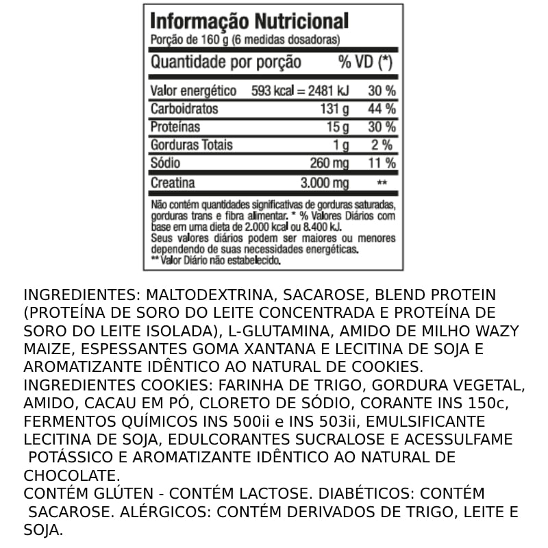 <p><span>O </span><b>Delicious Mass sabor cookies FTW</b><span> é um suplemento hipercalórico formulado com maltodextrina e waxy maize como fontes de carboidratos. Cada porção fornece <strong>15 g de proteína</strong>, combinando whey protein concentrado e isolado, além da adição de glutamina. Com sabor gourmet, é uma opção prática para complementar a ingestão calórica e proteica no dia a dia.</span></p> <h2><b>Sugestão de consumo: </b></h2> <p><span>Bata no liquidificador 6 medidas dosadoras (160 g) em 300 ml de água ou leite gelado, até completa homogeneização. Recomenda-se o consumo pela manhã e entre as principais refeições ou conforme orientação profissional.</span></p> <h2><b>Motivos para escolher o produto: </b></h2> <ul> <li aria-level="1"><span>Fornece 15 g de proteína</span></li> <li aria-level="1"><span>Elaborado com Waxy maize</span></li> <li aria-level="1"><span>Enriquecido com glutamina</span></li> <li aria-level="1"><span>Sabor gourmet</span></li> <li aria-level="1"><span>Opção prática para complementar a ingestão calórica diária</span></li> </ul> <h2><b>A marca:</b></h2> <p><span>A </span><b>FTW</b><span> nasceu do espírito </span><i><span>For The Win</span></i><span>, com a missão de oferecer suplementos de alta qualidade para quem leva o esporte a sério. Mais do que atender às demandas do desempenho físico, a marca inspira atletas de todos os níveis a superarem seus próprios limites, com produtos desenvolvidos para potencializar resultados. Com uma linha completa e rigorosamente testada, a FTW está presente na rotina de quem busca evolução constante. Cada fórmula carrega o compromisso com a performance, a saúde e a superação.</span></p>