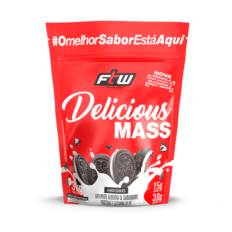 <p><span>O </span><b>Delicious Mass sabor cookies FTW</b><span> é um suplemento hipercalórico formulado com maltodextrina e waxy maize como fontes de carboidratos. Cada porção fornece <strong>15 g de proteína</strong>, combinando whey protein concentrado e isolado, além da adição de glutamina. Com sabor gourmet, é uma opção prática para complementar a ingestão calórica e proteica no dia a dia.</span></p> <h2><b>Sugestão de consumo: </b></h2> <p><span>Bata no liquidificador 6 medidas dosadoras (160 g) em 300 ml de água ou leite gelado, até completa homogeneização. Recomenda-se o consumo pela manhã e entre as principais refeições ou conforme orientação profissional.</span></p> <h2><b>Motivos para escolher o produto: </b></h2> <ul> <li aria-level="1"><span>Fornece 15 g de proteína</span></li> <li aria-level="1"><span>Elaborado com Waxy maize</span></li> <li aria-level="1"><span>Enriquecido com glutamina</span></li> <li aria-level="1"><span>Sabor gourmet</span></li> <li aria-level="1"><span>Opção prática para complementar a ingestão calórica diária</span></li> </ul> <h2><b>A marca:</b></h2> <p><span>A </span><b>FTW</b><span> nasceu do espírito </span><i><span>For The Win</span></i><span>, com a missão de oferecer suplementos de alta qualidade para quem leva o esporte a sério. Mais do que atender às demandas do desempenho físico, a marca inspira atletas de todos os níveis a superarem seus próprios limites, com produtos desenvolvidos para potencializar resultados. Com uma linha completa e rigorosamente testada, a FTW está presente na rotina de quem busca evolução constante. Cada fórmula carrega o compromisso com a performance, a saúde e a superação.</span></p>