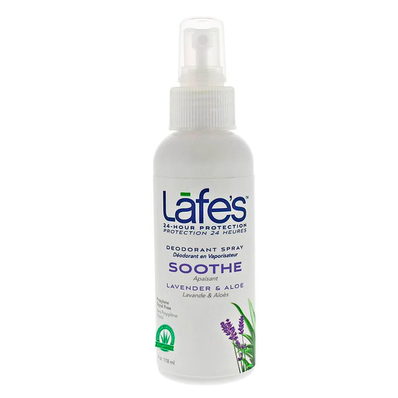 <p>O <strong>Deodorant Spray Soothe Lavander e Aloe Lafe's</strong>,<strong> </strong>possui uma combinação de óleos essenciais de lavanda para manter a pele calma e relaxada, aloe vera, que amacia, hidrata e ajuda a manter a pele fresca e saudável o dia inteiro. Não obstrui os poros, não contém alumínio e parabenos, além de não prejudicar a saúde. Deodorant livre de Cloridrato de Alumínio.</p> Sugestão de uso: <p>Aplique o Deodorant Spray Natural Soothe da Lafes’s nas axilas limpas e secas. Reaplique sempre que necessário. Cada corpo é único e por conta disso é difícil definir a quantidade de reaplicações. Para algumas pessoas se faz necessária a reaplicação a cada 4 horas. Já para outras, a cada 6 ou 8 é o suficiente. Também vale levar em consideração o estilo de vida e a temperatura do local onde a pessoa reside.</p> Motivos para escolher o produto: <ul> <li> <p>Produto 100% Natural e Vegano</p> </li> <li> <p>Possui propriedades antimicrobianas, bactericidas e suavizantes</p> </li> <li> <p>Protege a pele contra os maus odores por até 24h</p> </li> <li> <p>Não é um antitranspirante e não obstrui os poros</p> </li> <li> <p>Oferece uma suave fragrância de óleos essenciais naturais e orgânicos</p> </li> </ul> Sobre a marca: <p>Fundada em 1992 pelo americano Lafe Larson, a Lafe's fabrica cosméticos com ingredientes puros e de alta qualidade, enfatizando o compromisso em fornecer apenas o que há de melhor em produtos de cuidados pessoais e que contribuem para uma vida mais saudável. A marca possui uma forte responsabilidade ambiental e sustentável, apoia o comércio justo e não faz testes em animais. É uma empresa certificada pela Certified B Corporation, garantindo que ela cumpre rigorosos padrões de responsabilidade e transparência. Além disso, doa 1% do lucro global para entidades de prevenção ao câncer de mama e de consciência ambiental.</p>