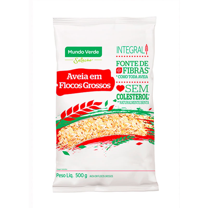 <p>A <strong>Aveia em Flocos Grossos Integral Mundo Verde Seleção 500g</strong> são opções fonte de fibras e podem ser adicionados em diversas preparações.</p> Sugestão de consumo: <p>Pode ser adicionada em frutas, como morango ou banana, consumida na forma de mingau, panqueca, em shakes e vitaminas ou até utilizada no preparo de bolos e tortas, existem muitas receitas.</p> Alergênicos: <p>Contém derivados de aveia. Pode conter soja, trigo, cevada e centeio.</p> Motivos para escolher o produto: <ul> <li> <p>Integral</p> </li> <li> <p>Fonte de fibras</p> </li> <li> <p>Rende 17 porções</p> </li> <li> <p>Sem adição de açúcares</p> </li> <li> <p>Sem conservantes</p> </li> <li> <p>Zero lactose</p> </li> </ul> Sobre a marca: <p>A <strong>Mundo Verde Seleção </strong>é uma linha de produtos para quem quer ter uma vida mais saudável e gostosa. A marca quer ajudar a colocar essas escolhas em prática. A paixão e conhecimento pelos alimentos, nutrientes, aromas e sabores permitem a seleção das melhores opções saudáveis para qualquer ocasião. Conheça a linha completa Mundo Verde Seleção, com inúmeros produtos saudáveis e gostosos para facilitar seu dia a dia.</p>