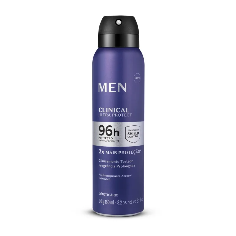 Desodorante Antitranspirante Aerosol Men Clinical Ultra Protect 90g/150ml<br /> Men une tecnologia a fórmulas potentes para desenvolver o seu melhor aliado contra a transpiração.<br /> <br /> <br /> <br /> O Desodorante Antitranspirante Aerosol Men Clinical Ultra Protect garante proteção prolongada contra a transpiração e cuidados extremos com sua pele.<br /> <br /> <br /> <br /> Ideal para a rotina agitada, este desodorante aerosol promove 96 horas de proteção antibacteriana, deixando sua pele livre de maus odores. Com jato seco, seca rapidamente e não mancha suas roupas.<br /> <br /> <br /> <br /> Com a exclusiva Tecnologia Shield Control desenvolvida por experts em ciência da pele. Conta com uma potente fórmula antitranspirante, combinada a um blend de Alantoína, Bisabolol e Vitamina E, reconhecidos por proteger, acalmar e cuidar da pele. <br /> <br /> <br /> <br /> Confira alguns de seus benefícios:<br /> <br /> <br /> <br /> 96h de proteção contra o mau odor e transpiração;Sensação de frescor prolongado;Secagem rápida e toque seco;Não deixa a axila pegajosa;Sem álcool etílico ou corantes;Cápsulas ativas de fragrância com liberação prolongada;Clinicamente e dermatologicamente testado.<br /> <br /> <br /> <br /> Além disso, o Desodorante Aerosol Men Clinical Ultra Protect possui cápsulas da fragrância amadeirada de MEN que neutralizam o mau odor ao detectar suor ou movimentos do corpo.<br /> <br /> <br /> <br /> Nenhum produto O Boticário é testado em animais, ou seja, este item possui selo Cruelty Free.<br />