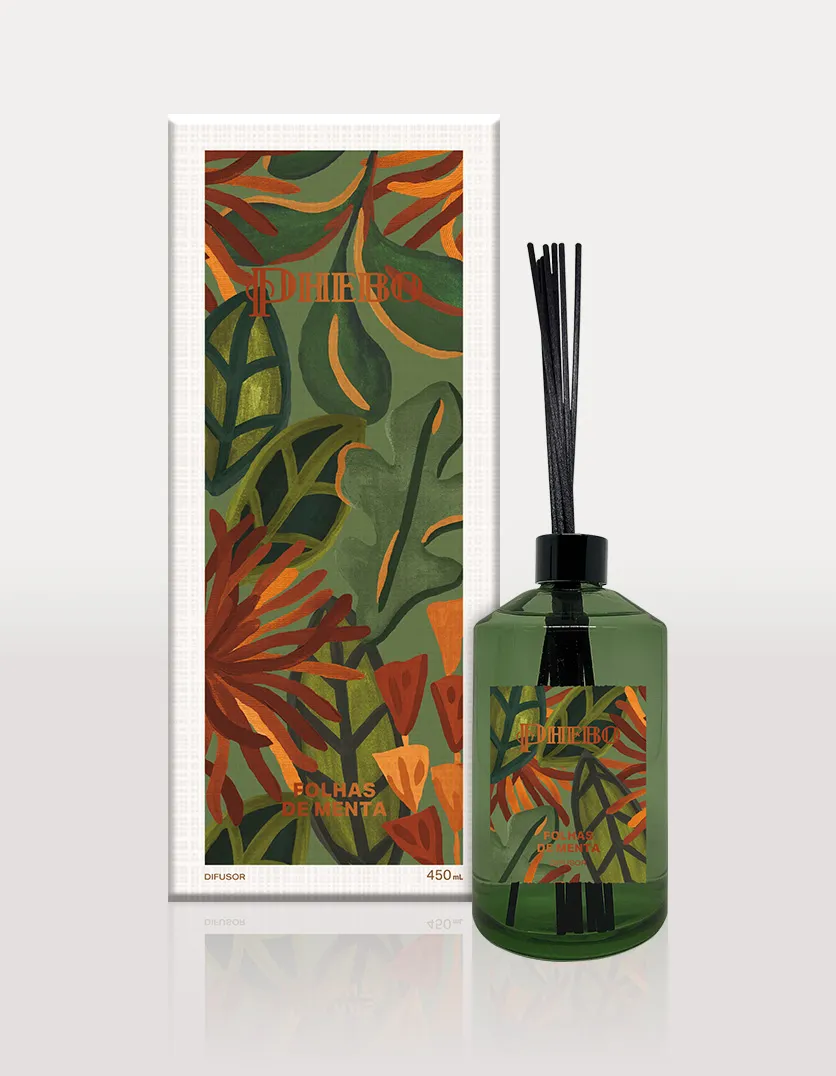 Inspirada nas tradicionais garrafadas de ervas do Pará, a linha Aromáticos destila o frescor vivo das plantas e ervas em combinações que exalam rusticidade e naturalidade. Folhas de Menta traz uma fragrância vibrante com notas cítricas e aromáticas, que despertam os sentidos com leveza e pureza. Com 85% de ingredientes de origem natural, o Difusor Folhas de Menta perfuma os espaços de forma contínua, exalando o frescor das ervas e plantas. Com um design sofisticado em vidro verde translúcido, sua embalagem valoriza a naturalidade da linha e transforma o ambiente em um refúgio de rusticidade e bem-estar. Vegano. Livre de corantes e parabenos. Conteúdo: 450ml.