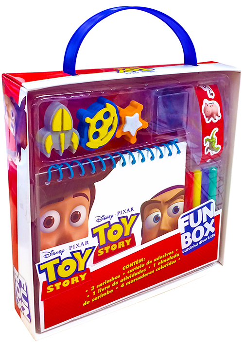 Uma caixinha divertida, cheia de atividades e desenhos para colorir os personagens de Toy Story 3. Inclui 3 carimbos cartela de adesivos 1 livro de atividades 1 almofada de carimbo e 4 marcadores coloridos