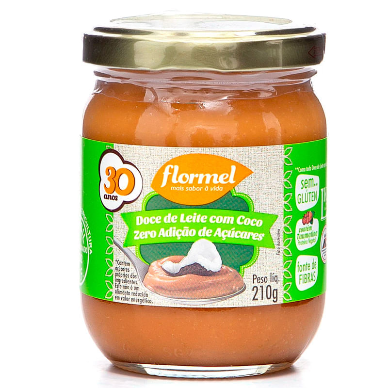 Informações técnicas do produto:<br> O Doce de Leite com Coco, da Flormel é uma versão sem açúcar do tradicional doce de leite com um toque especial de coco ralado natural. Indicado para pessoas que buscam uma alimentação equilibrada.<br> <br> Recomendação de consumo:<br> Produto pronto para o consumo, ideal para lanches intermediários, que pode ser consumido com bolos, pães, torradas, puro ou em receitas.<br> <br> Informações sobre alergênicos:<br> Contém leite e derivados. Pode conter nozes, castanha de caju, macadâmia, amêndoas, castanha do pará, pistache e amendoim.<br> <br> Por que escolher esse produto?<br> Sem glúten<br> Fonte de fibras<br> Sem adição de açúcares<br> Adoçado com taumatina<br> Isento de gordura trans<br> Sobre a marca:<br> Fundada em 1987, a Flormel é uma empresa líder no segmento de doces e sobremesas sem adição de açúcar e se tornou referência de excelência na indústria de alimentos. Tem como objetivo desenvolver produtos saborosos que são saudáveis, nutritivos e funcionais para seus consumidores. Com mais de 15 mil pontos de venda, hoje a Flormel está presente em todas as regiões brasileiras, e exporta seus produtos para a América Latina, países do Oriente Médio e Estados Unidos.
