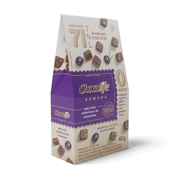 Informações técnicas sobre o produto:<br> O Drageado Senses Açaí Com Cobertura De Chocolate, da Chocolife, 40g, é composto por quadradinhos de açaí in natura cobertos com o delicioso chocolate 71%, um snack prático e perfeito para hora do lanche. Com ingredientes naturais e livre de glúten e açúcar.<br> <br> Recomendações de consumo:<br> O Drageado Senses Açaí Com Cobertura De Chocolate pode ser consumido após a principais refeições, almoço e jantar, ou para matar a vontade de consumir doce.<br> <br> Porque escolher este produto:<br> Sem açúcar<br> Sem glúten<br> Sem lactose<br> Livre de gordura trans<br> Livre de soja<br> Vegano<br> Fonte de fibras<br> Sem adição de corantes artificiais<br> Adoçado com Stévia (sem sabor residual)<br> Sobre a marca:<br> A Chocolife oferta uma linha extensa de produtos, como achocolatados, chocolates em barra, shakes, creme de avelã, produtos com proteínas vegetais, entre outros. Tem como objetivo desenvolver produtos funcionais que são saborosos e saudáveis.