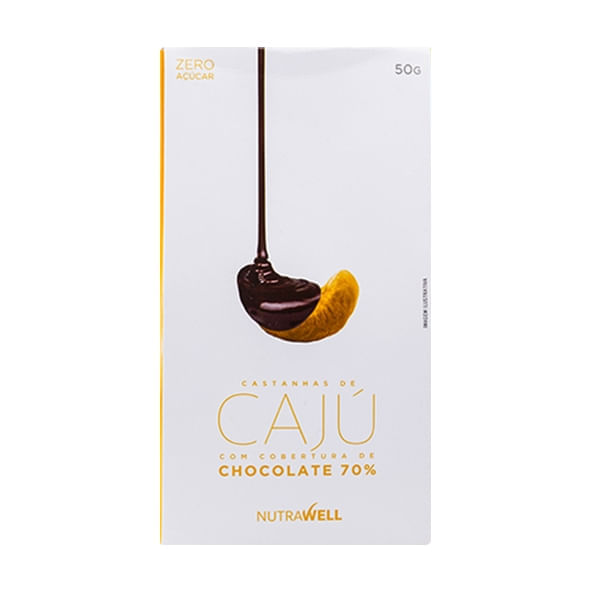 Informações técnicas do produto:<br> Castanhas de Caju com Chocolate 70%, 50g da Nutrawell são pedaços de castanha de caju coberto com chocolate 70% cacau, sem adição de açúcar e adoçantes artificiais. É fonte de proteínas, fibras, vitaminas e minerais. A união dos sabores e benefícios nutricionais do cacau e da Castanha de Caju em um único produto.<br> <br> Recomendação de consumo:<br> Uma ótima opção para ser consumido nos lanches intermediários ou como sobremesa.<br> <br> Informações sobre alergênicos:<br> Não contém glúten. Alérgicos: Contém derivados de soja. Pode conter traços de leite, amendoim, amêndoa, avelã, castanha-de-caju, nozes e pistache. Não contém conservantes. Diabéticos: este produto não contém sacarose. Não contém lactose <br> <br> Por que escolher esse produto?<br> Zero adição de açúcares<br> 70% cacau<br> Sem glúten<br> Sem lactose<br> Fonte de fibras