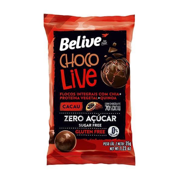 <p>Informações técnicas do produto:<br>Os Drageados Chocolive Cacau, da Belive, 35g, são compostos por flocos de cereais integrais com cacau cobertos com chocolate amargo 70 % cacau, sem adição de açúcar. Não possui glúten, sendo uma opção de consumo para pessoas com sensibilidade ou alérgicas à esta proteína.<br><br>Recomendação de consumo:<br>Uma ótima opção para acompanhar um chá ou café e adoçar o seu dia.<br><br>Informações sobre alergênicos:<br>Contém derivados de soja, pode conter leite.<br><br>Por que escolher esse produto?<br>Sem glúten<br>Sem lactose<br>Sem adição de açúcar<br>Aprovado pela ANAD (Associação Nacional de Assistência ao Diabético)<br>Fonte de Fibras<br>Com grãos integrais: sorgo, chia e quinoa<br>Com proteína isolada de batata<br>Sobre a marca:<br>A BeLive Be free, é uma marca que acredita que para ser livre, é preciso ter escolhas saudáveis e saborosas. É dar espaço para a alegria da liberdade de comprar o que você realmente gosta. É comprar o produto sem medo e comer sem culpa.</p>