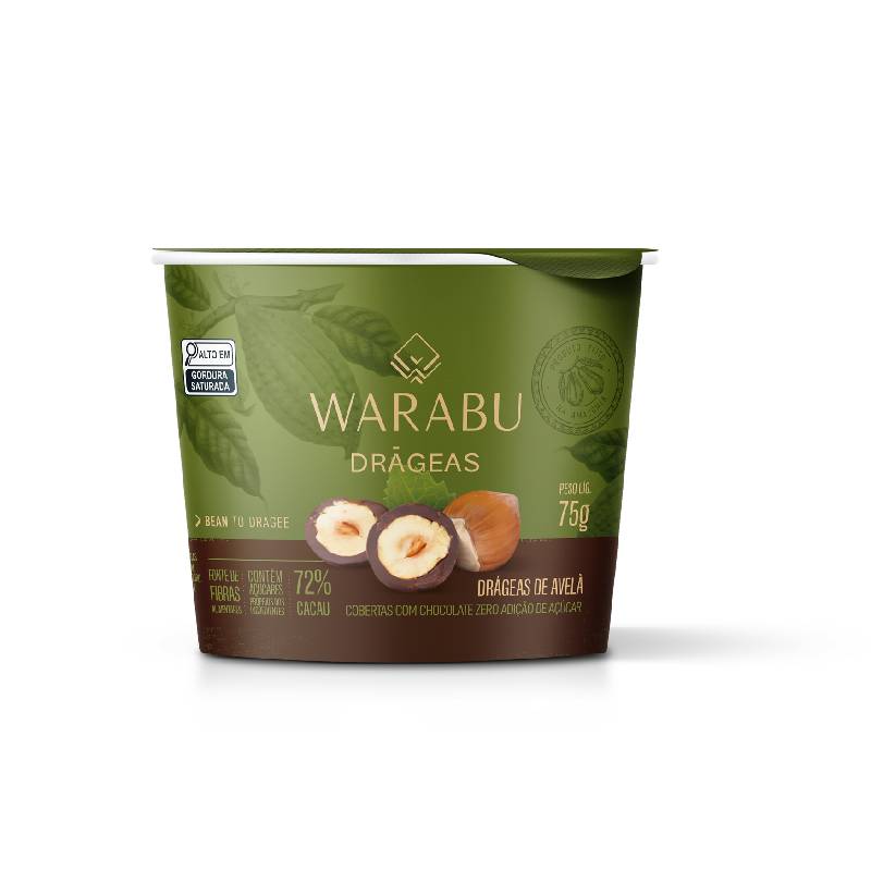 <p>O <strong>drageado da Wabaru</strong> é feito com <strong>pedaços de avelã cobertas com chocolate 72% cacau zero açúcar</strong>, juntos eles promovem o equilíbrio perfeito, unindo a intensidade do cacau com a crocância da avelã.</p> <h2><strong>Sugestão de consumo:</strong></h2> <p>Super versátil, as drágeas Wabaru podem ser consumidas como sobremesa ou fazendo parte de receitas culinárias.</p> <h2><strong>Motivos para escolher o produto:</strong></h2> <ul> <li> <p>Embalagem com 75g;</p> </li> <li> <p>Clean-label;</p> </li> <li> <p>Zero adição de açúcares;</p> </li> <li> <p>Sem OGM (organismos geneticamente modificados);</p> </li> <li> <p>Sem conservantes, adoçantes e aromas artificiais;</p> </li> <li> <p>Livre de glúten e de lactose.</p> </li> </ul> <h2><strong>A Marca</strong></h2> <p>A Wabaru foi fundada pelo chef e empresário Jorge Neves no ano de 2018, a marca nasceu com o propósito de resgatar a cultura do cultivo do cacau na Amazônia. Cada chocolate é desenvolvido com cacau selvagem orgânico, de espécie nativa, situada na bacia Amazônica, garantindo um chocolate rico em sabor, responsabilidade e compromisso com a natureza e as pessoas que nela vivem.</p> <p> </p>
