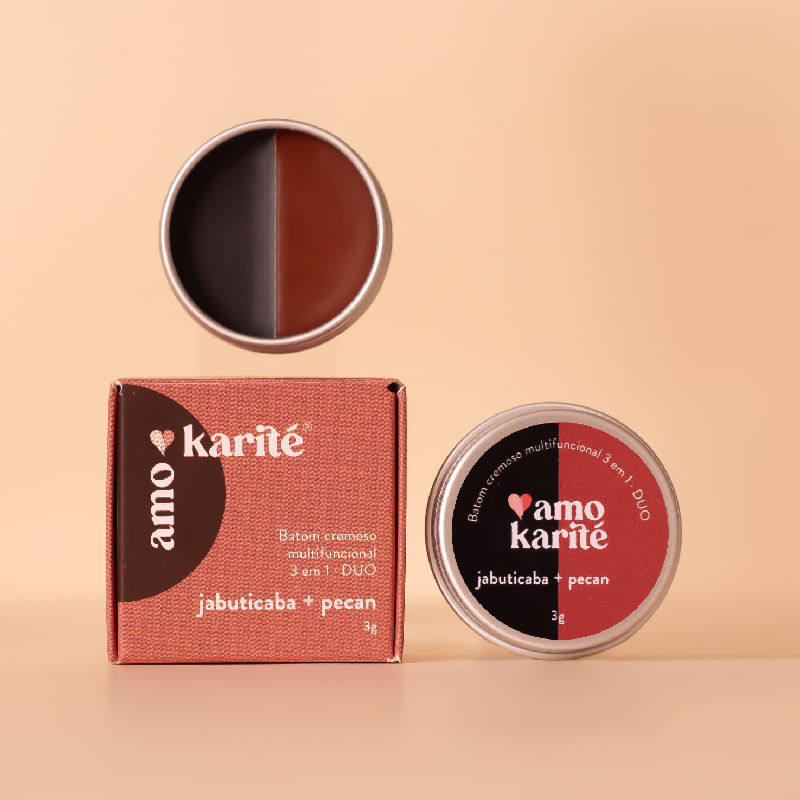 <p>O <strong>DUO Batom Cremoso Multifuncional 3 em 1 - Jabuticaba + Pecan 3g da Amokarité</strong> funciona como <strong>blush, batom, sombra, delineador e contorno</strong>, oferecendo um acabamento cremoso e suave em uma embalagem ecológica de alumínio.</p> <p>Ideal para realçar sua beleza, além de nutrir e hidratar a pele, com uma fórmula rica em ingredientes naturais. Perfeito para quem valoriza a praticidade sem abrir mão de um cuidado consciente com o meio ambiente.</p> <h2><strong>Sugestão de uso: </strong></h2> <p>O DUO Multifuncional pode ser aplicado em diferentes regiões do rosto ou corpo, diretamente com os dedos ou com o auxílio de pincéis e espátulas.</p> <p>A intensidade da cor pode ser ajustada pela quantidade de produto aplicada. Para uma finalização mais seca, use um pó mineral após a aplicação, e para um acabamento mais hidratante, aplique um balm labial antes.</p> <h2><strong>Motivos para escolher o produto:</strong></h2> <ul> <li>Versátil: pode ser usado como blush, batom, sombra, delineador e contorno.</li> <li>Fórmula rica em ingredientes naturais, como Manteiga de Karité e Óleo de Rícino, que hidratam e nutrem a pele.</li> <li>Embalagem sustentável: feita de alumínio, o material mais reciclável do mundo.</li> <li>Produto 100% natural, vegano e cruelty-free.</li> <li>Clean beauty e skinfood: cuida da sua pele com ingredientes seguros e nutritivos.</li> <li>Reduz o impacto ambiental, com embalagem que se decompõe rapidamente.</li> </ul> <h2><strong>A Marca:</strong></h2> <p>A Amokarité nasceu com o propósito de oferecer maquiagens e cosméticos que respeitem tanto o corpo quanto o planeta, com produtos inovadores e totalmente livres de ingredientes de origem animal. A marca se tornou uma referência em cosméticos veganos e ecológicos, com transparência em seus insumos e embalagens que minimizam o impacto ambiental.</p>