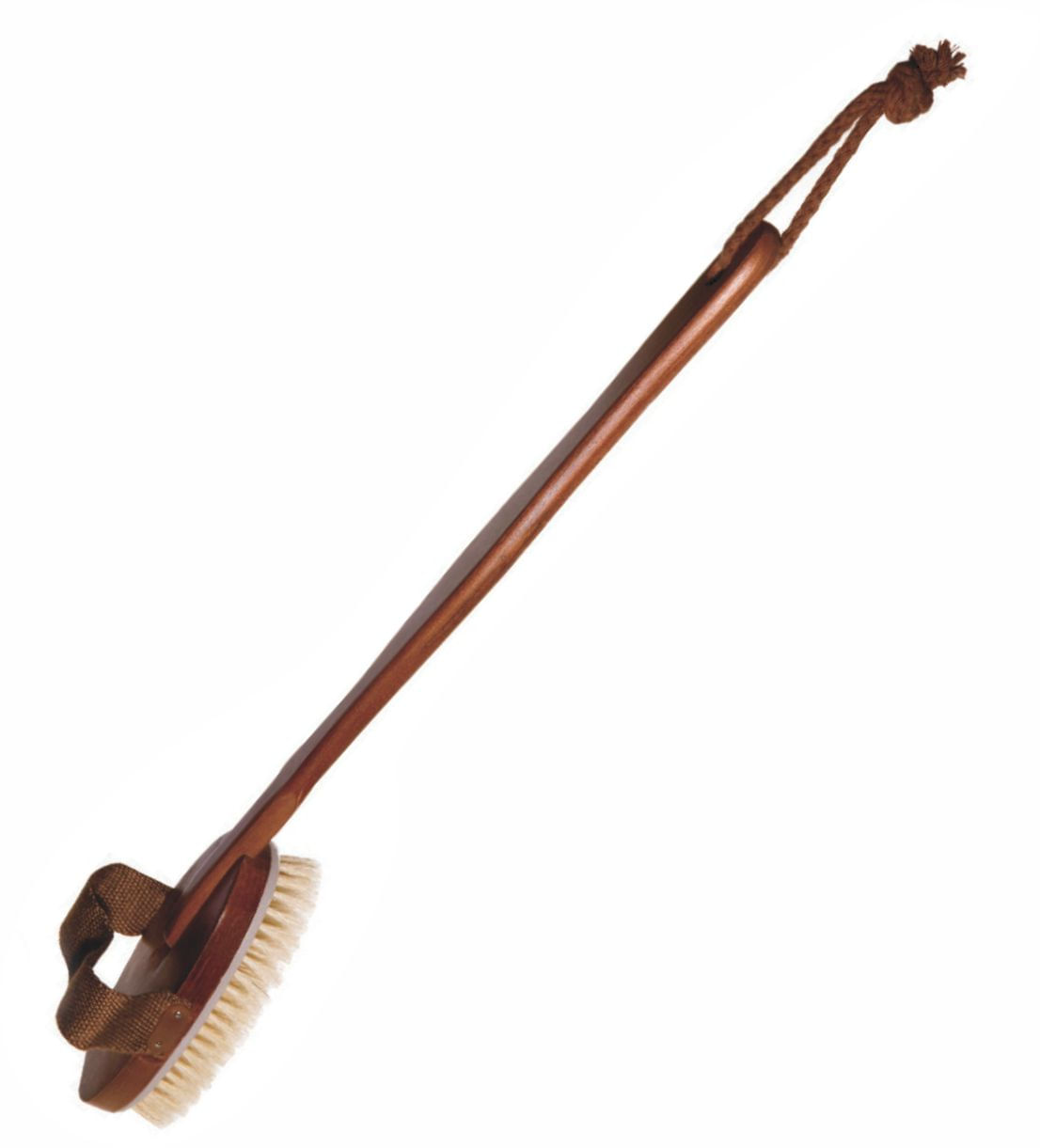 Escovão de madeira p/ banho 45,5 X 6,7 X 4,0 cm. O escovão de banho possui cabo longo para facilitar o alcance de áreas mais difíceis, facilitando a higienização corporal.