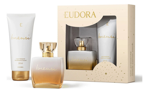 Kit Presente Imensi EudoraO Kit Presente Imensi é um horizonte de possibilidades!Com dois itens, traz o desodorante colônia com uma perfumação vibrante e marcante, combinada com a maciez da loção hidratante.O presente feminino ideal, vem em uma caixa para presente sofisticada, pronto para presentear!Confira:COLÔNIA DESODORANTEImensi Desodorante Colônia é uma fragrância que harmoniza notas abertas, refinadas, femininas e sensuais. Inspirada na beleza marroquina, sua fórmula conta com acordes de Flores do Deserto, aflorando e trazendo também o frescor das flores de laranjeira. LOÇÃO CORPORALA Loção Hidratante Desodorante Corporal Imensi também traz o acorde exclusivo das flores do deserto, sendo uma loção corporal cremosa e exuberante. Ideal para hidratar a pele, a loção Imensi potencializa a rotina de cuidados. CAIXA PARA PRESENTENenhum produto Eudora é testado em animais, ou seja, este item possui selo Cruelty Free.Este kit contém:01 Imensi Desodorante Colônia 100ml01 Loção Hidratante Desodorante Corporal Imensi 200ml