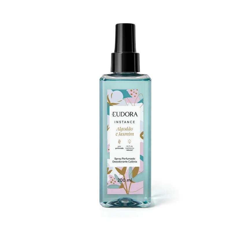 Spray Perfumado Desodorante Colônia Instance Algodão e Jasmim 200ml<br /> O Spray Perfumado Desodorante Colônia Instance Algodão e Jasmim traz uma perfumação floral delicada e elegante!<br /> <br /> <br /> <br /> Idealizada para quem ama uma rotina de autocuidado diária e gosta de produtos de qualidade, a Linha Instance Eudora alia cuidados diários a fragrâncias inesquecíveis. <br /> <br /> <br /> <br /> A combinação do conforto do Algodão com a sofisticação do Jasmim traz uma fragrância floral delicada e elegante para uma pele perfumada e desodorizada.<br /> <br /> <br /> <br /> Vegano, este body splash Eudora Instance Algodão e Jasmim é formulado com 92,7% de ingredientes naturais selecionados para oferecer o melhor à sua pele.<br /> <br /> <br /> <br /> Pensado para o seu bem-estar e um dia a dia com mais amor próprio, o Spray Perfumado Desodorante Colônia Instance Algodão e Jasmim é ideal para carregar consigo para todos os lugares e manter-se sempre com o seu cheirinho preferido!<br /> <br /> <br /> <br /> Família Olfativa: Floral Floral.