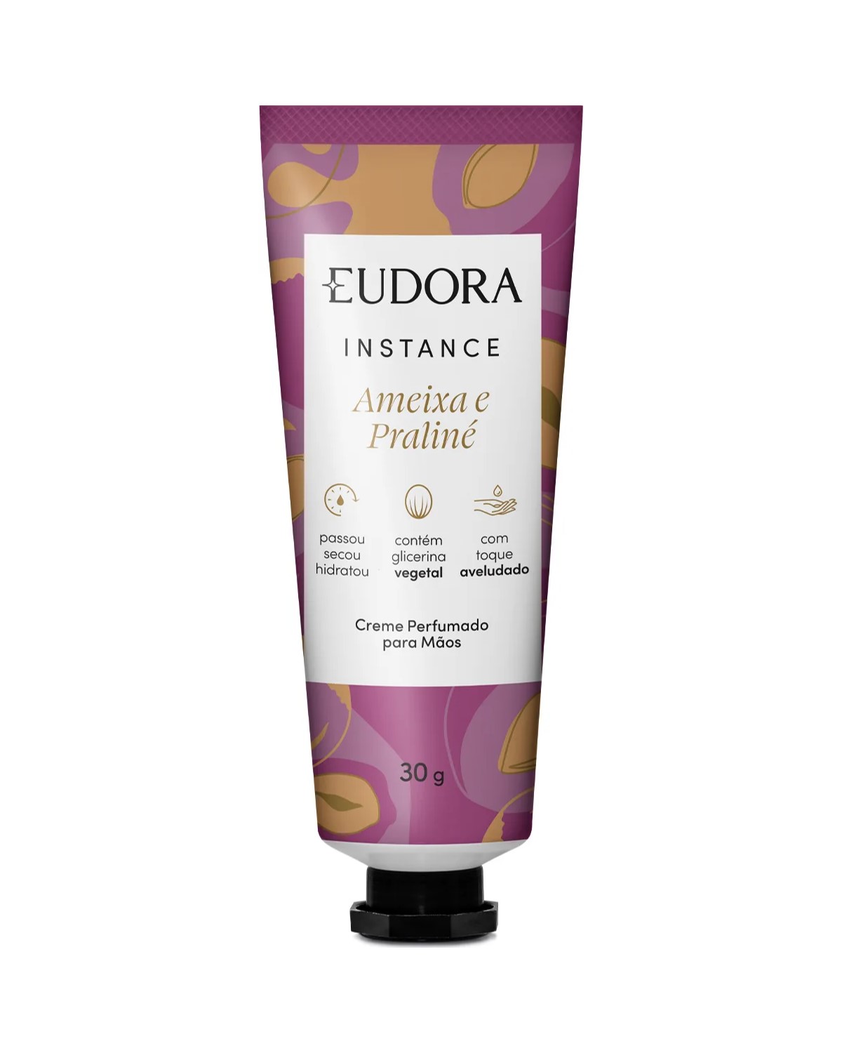 Creme Perfumado Para As Mãos Instance Ameixa e Praliné 30g<br /> Eudora Instance traz para a sua rotina de cuidados básicos o Creme Perfumado Para As Mãos Instance Ameixa e Praliné. Com Glicerina Vegetal, traz a delicadeza da Ameixa com a doçura do Praliné em uma explosão de fragrância.<br /> <br /> <br /> Confira os benefícios deste creme para mãos:<br /> <br /> <br /> Hidratação profunda <br /> Secagem rápida: passou, secou, hidratou!<br /> Textura em gel;<br /> Toque aveludado<br /> Não danifica o esmalte;<br /> Tamanho prático ideal para carregar na bolsa, mochila ou nécessaire.<br /> <br /> O resultado são mãos profundamente hidratadas, perfumadas e prontas para a estação mais fria do ano!<br /> <br /> <br /> Pensando no seu bem-estar e do planeta, é livre de Sulfato, Parabenos, Petrolatos e Óleo Mineral. A embalagem é feita com plástico vegetal derivado da cana-de-açúcar.<br /> <br /> <br /> SOBRE A LINHA:<br /> <br /> <br /> Eudora Instance sabe: você adora se cuidar e seu tempo é precioso. Instance é cuidado no seu tempo. Por isso, apresenta Ameixa e Praliné, uma linha que une a suculência da Ameixa Roxa com a indulgência do Praliné, combinação para a rotina de cuidados da mulher de Eudora!<br /> <br /> <br /> Nenhum produto Eudora é testado em animais, ou seja, este item possui selo Cruelty Free. Produto vegano.