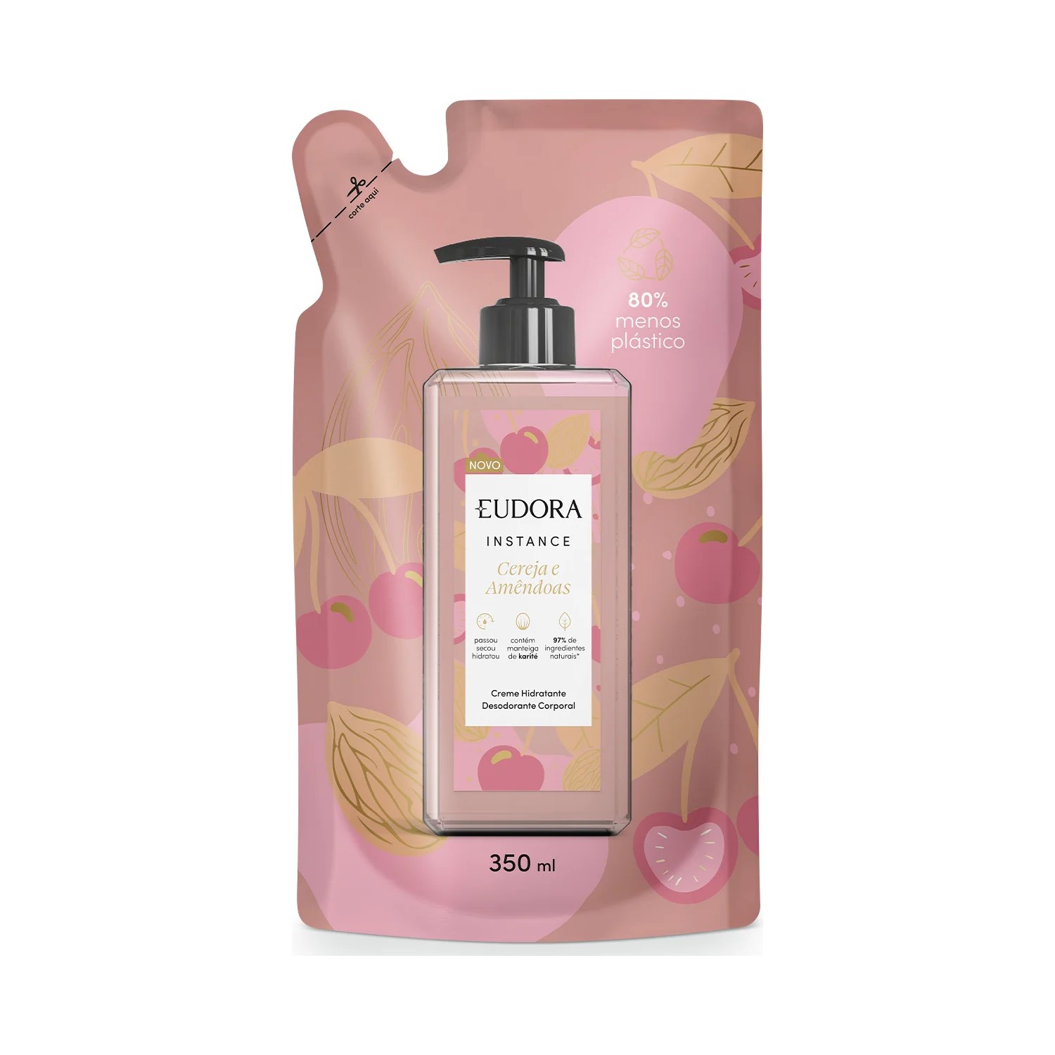 Eudora Refil Creme Hidratante Instance Cereja e Amêndoas 350 ml.<br /> <br /> O novo Refil Creme Hidratante Desodorante Corporal Instance Cereja e Amêndoas repõe a fragrância suave e deliciosa do seu creme hidratante preferido! <br /> <br /> <br /> <br /> Eudora sabe que você adora se cuidar e que seus recursos são valiosos, por isso a embalagem refil vem para trazer mais economia e praticidade para a sua rotina de autocuidado. <br /> <br /> <br /> <br /> Este produto é vegano e combina Manteiga de Karité, 97% de ingredientes naturais e glicerina vegetal, junção pensada para proporcionar hidratação profunda com pele macia e desodorizada. <br /> <br /> <br /> <br /> A combinação da suculência da cereja com a cremosidade das amêndoas traz uma fragrância floriental adocicada e envolvente para uma pele perfumada e desodorizada, além de oferecer secagem rápida que não pesa na pele e nem gruda. <br /> <br /> <br /> <br /> O creme hidratante deixa a sua pele macia, perfumada e profundamente hidratada o dia inteiro, ideal para um dia a dia com mais autocuidado.<br /> <br /> <br /> <br /> E o melhor? Passou, Secou, Hidratou!