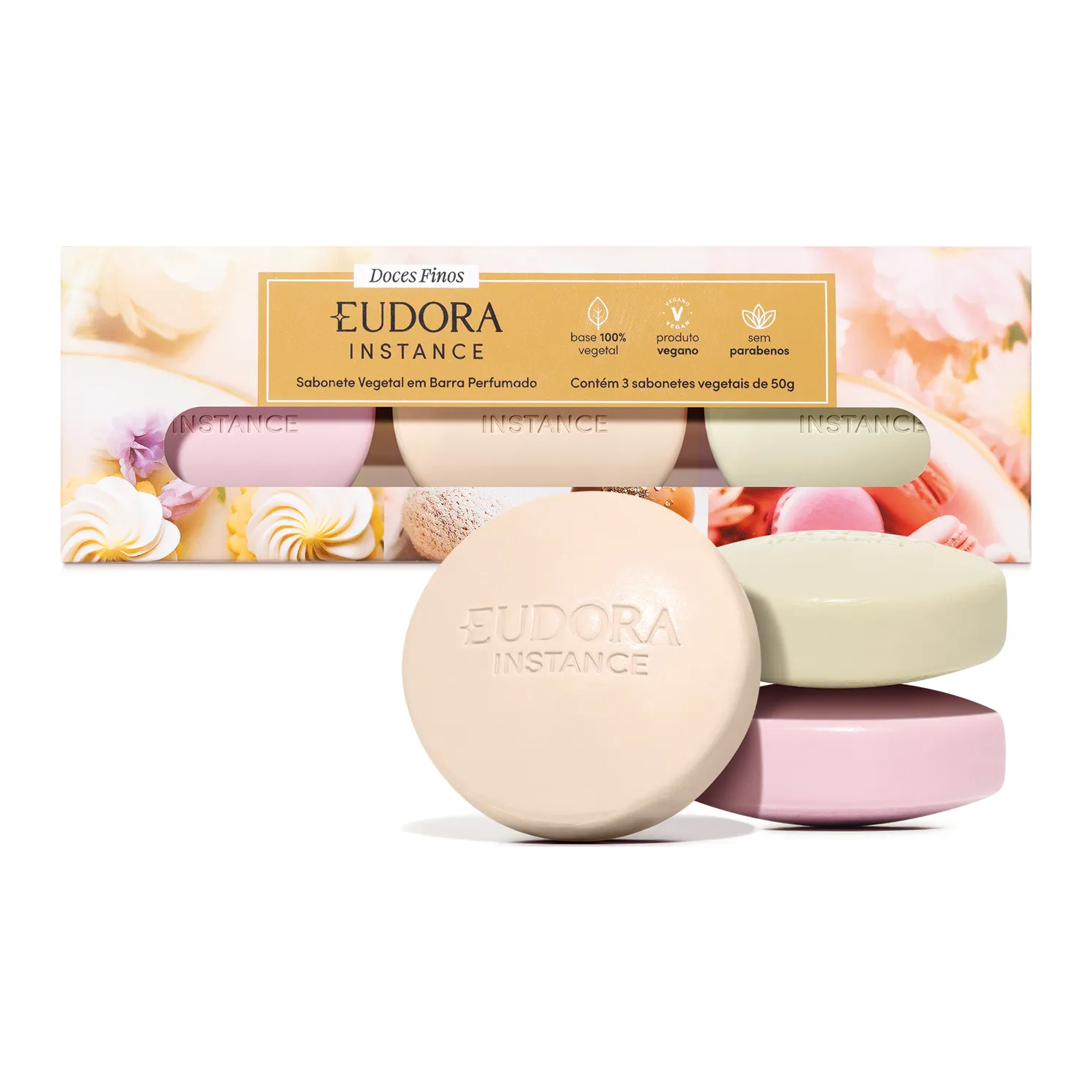 Kit Sabonete em Barra Vegetal Instance: Tartelete de Limão 50g + Bombom de Avelã 50g + Macaron de Framboesa 50g<br /> Eudora Instance Sabonete em Barra Vegetal possui espuma cremosa e limpa sem ressecar, deixando sua pele com toque macio, suave e perfumado. Além disso, possui os seguintes benefícios:<br /> <br /> <br /> Espuma cremosa<br /> Vegano<br /> Sem parabenos<br /> <br /> Eudora Instance e a confeiteira Beca Milano co-criam a nova linha de cuidados inspirada no universo glamouroso dos Doces Finos. Eudora Instance Doces Finos, em Edição Limitada, traz uma experiência deliciosa e refinada com cheirinho Gourmand delicioso. Aproveite também para presentear!<br /> <br /> <br /> Os sabonetes apresentam as fragrâncias: <br /> <br /> <br /> Tartelete de Limão Siciliano<br /> <br /> <br /> Toda a elegância do Tartelete de Limão Siciliano em uma fragrância Oriental Gourmand irresistível e brilhante.<br /> <br /> <br /> Bombom de Avelã<br /> <br /> <br /> Todo o requinte do Bombom de Avelã em uma fragrância Floriental Gourmand cremosa e surpreendente.<br /> <br /> <br /> Macaron de Framboesa<br /> <br /> <br /> Todo o glamour do Macaron de Framboesa em uma fragrância Floral Frutal suculenta e cativante.<br /> <br /> <br /> SOBRE A LINHA<br /> <br /> <br /> A Linha Instance é formada por ingredientes naturais nutritivos que agem em instantes, para transformar sua rotina de beleza em momentos inesquecíveis de autocuidado. Livre de parabenos, sulfatos, petrolatos e óleo mineral, entrega o cuidado que a sua pele merece.<br /> <br /> <br /> Nenhum produto Eudora é testado em animais, ou seja, este item possui selo Cruelty Free.