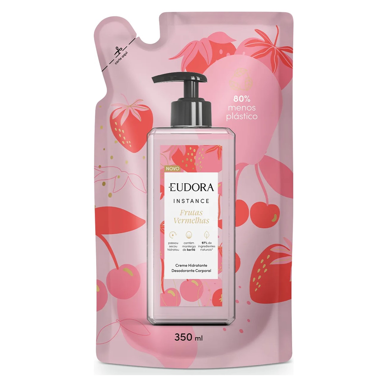 Refil Creme Hidratante Desodorante Corporal Instance Frutas Vermelhas 350ml.<br /> <br /> <br /> O novo Refil Creme Hidratante Desodorante Corporal Frutas Instance Vermelhas repõe a fragrância suave e deliciosa do seu creme hidratante preferido! <br /> <br /> Eudora sabe que você adora se cuidar e que seus recursos são valiosos, por isso a embalagem refil vem para trazer mais economia e praticidade para a sua rotina de autocuidado. <br /> <br /> Este produto é vegano e combina Manteiga de Karité, 97% de ingredientes naturais e glicerina vegetal, junção pensada para proporcionar hidratação profunda com pele macia e desodorizada. <br /> <br /> A combinação do dulçor das frutas vermelhas com a cremosidade de notas de baunilha traz uma fragrância frutal alegre e surpreendente para uma pele perfumada e desodorizada, além de oferecer secagem rápida que não pesa na pele e nem gruda. <br /> <br /> O creme hidratante deixa a sua pele macia, perfumada e profundamente hidratada o dia inteiro, ideal para um dia a dia com mais autocuidado.<br /> <br /> E o melhor? Passou, Secou, Hidratou!<br /> <br />