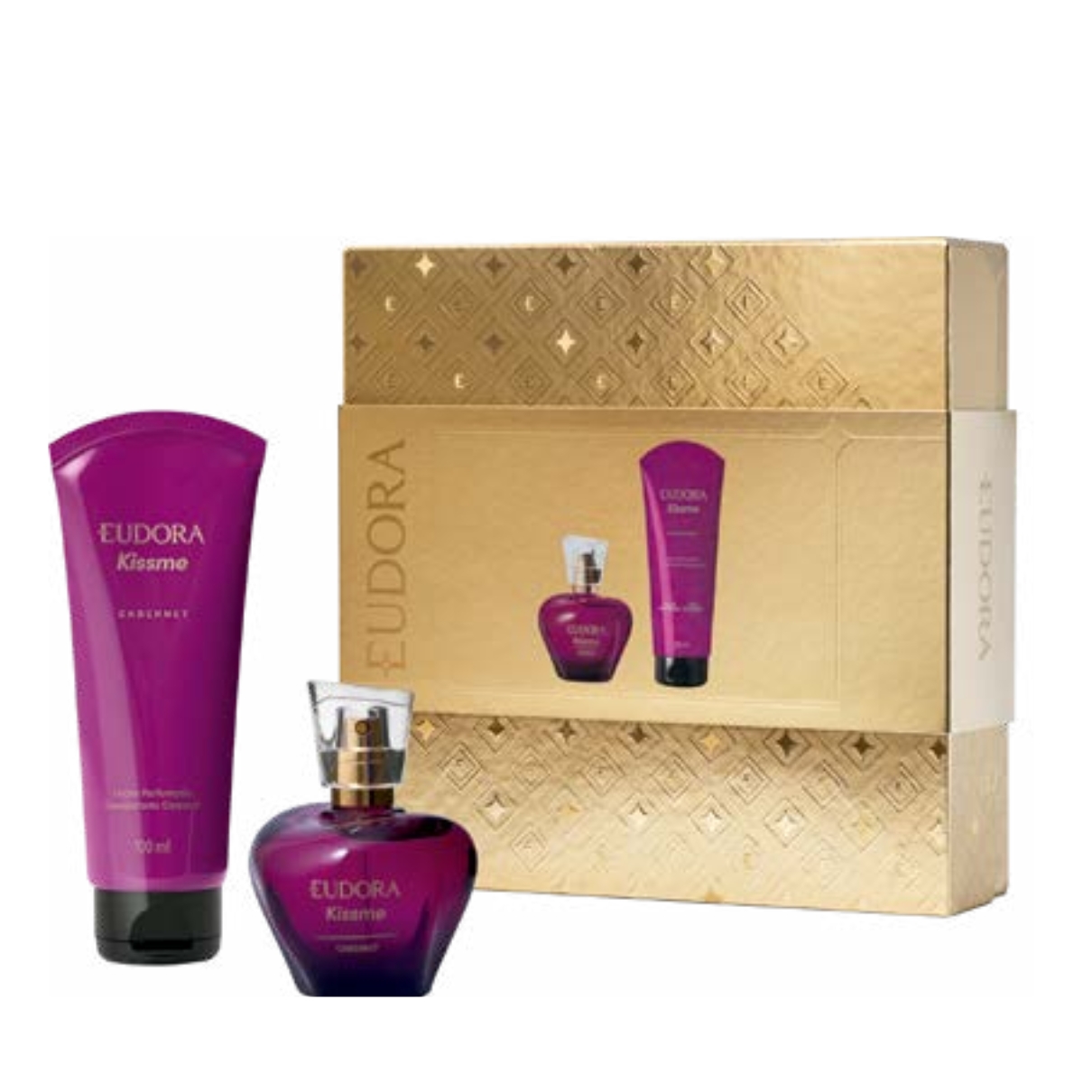 Kit Kiss Me Cabernet Colônia 50ml + Loção Hidratante 100ml EudoraEste kit contém:1 Colônia Eudora Kiss Me Cabernet 50ml.1 Loção Hidratante Corporal Kiss Me Cabernet 100ml.Acompanha sacola de presente EudoraA Colônia Desodorante Kiss Me Cabernet mistura a sensualidade das frutas vermelhas com a feminilidade das flores brancas. Notas cremosas de baunilha marcam presença nesta fragrância de atitude.Com textura leve e rápida absorção, a Loção Hidratante Corporal Kiss Me Cabernet hidrata a pele por até 30 horas, deixando-a com um toque macio, além de também perfumar e intensificar o aroma da deo colônia na pele.