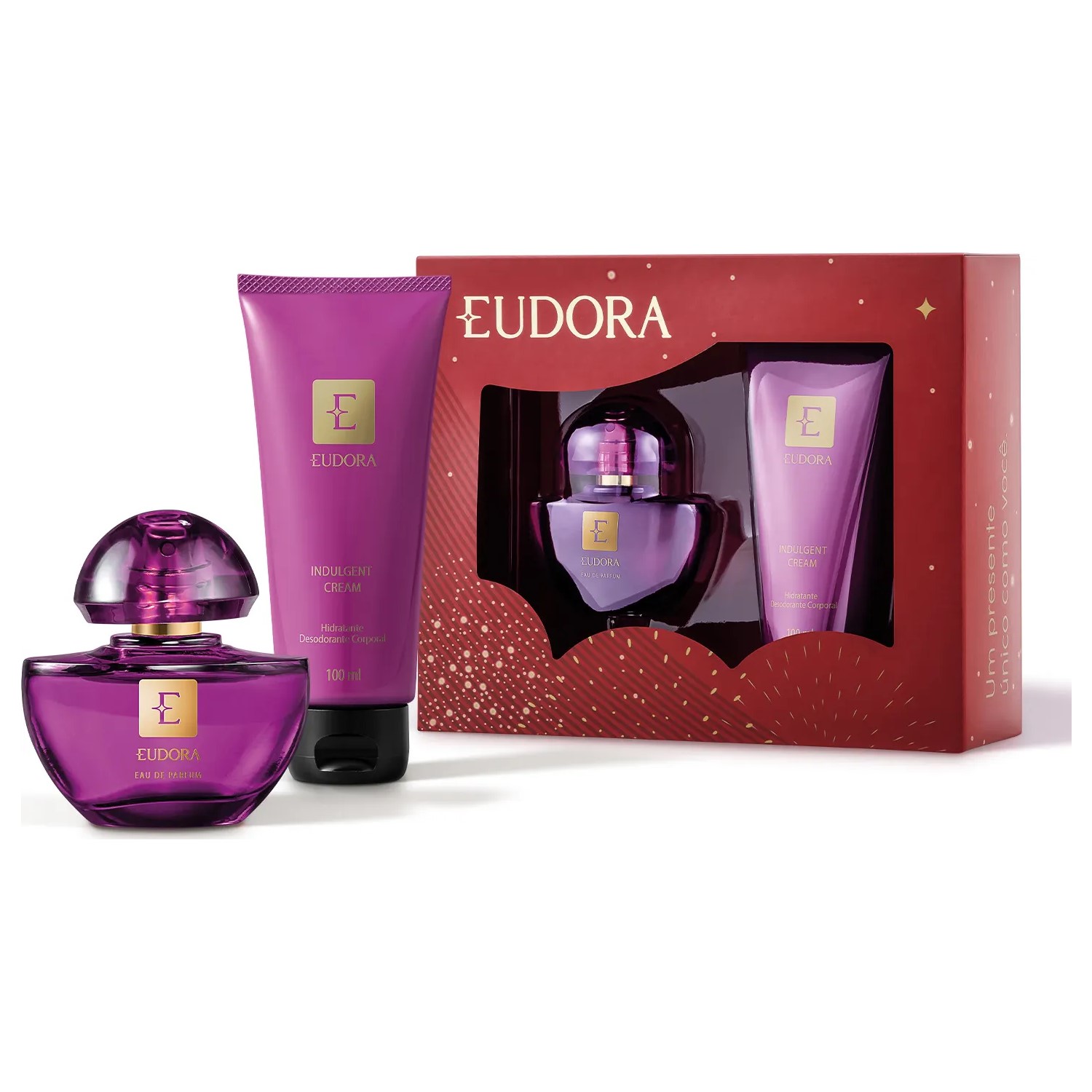 Kit Presente Natal Eudora Roxo Miniatura (2 itens) O Kit Presente Natal Eudora Roxo Miniatura é ideal para quem ama fragrância de Eudora EDP. Ele vem com 2 itens de autocuidado e perfumação envolvente para as melhores ocasiões, combinando com a sua lista de ideias de presente de natal. Em versão miniatura, vem em uma caixa para presente sofisticada, pronto para presentear! Confira: EAU DE PARFUM Eudora Eau de Parfum é uma fragrância sofisticada e intensa, com notas repletas de personalidade. A combinação floral sensual carrega especiarias selecionadas que traduzem a assinatura de mulheres inesquecíveis. Chamado carinhosamente de "Eudora Roxo", nosso Eau de Parfum foi criado para mulheres que são donas de um poder de atração único, capazes de instigar, provocar e conquistar de uma forma poderosamente feminina. Família Olfativa: Chypre Amadeirado. HIDRATANTE DESODORANTE CORPORAL Em uma textura cremosa, o Creme Hidratante Desodorante Corporal Indulgent Cream traz a fragrância marcante e envolvente da linha . Ideal para manter os cuidados com o corpo, garante hidratação intensa por até 48 horas, mantendo a pele com toque acetinado além de perfumada por mais tempo. O resultado é uma pele hidratada e fragrância que dura mais. CAIXA PARA PRESENTE Em um vermelho clássico de Natal,o brilho e os tons de dourado completam a entrega de sofisticação e celebração através dessa caixa de presente. Os fogos de artifício ilustrados unem o glamour das comemorações com os sentimentos e desejos que temos nessa época do ano: vamos celebrar juntos as conquistas e mudanças que nos tornam únicos! A mensagem “Um presente único como você” reflete a característica mais especial deste kit pronto para presentear e da pessoa presenteada.
