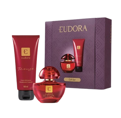 Presente Eudora Kit Rouge Perfume E Loção Desodorante Corporal.<br /> <br /> <br /> Eudora Rouge Eau de Parfum 35ml + Creme Hidratante Corporal 100ml traz inspiração no poder e na confiança que o vermelho desperta.<br /> <br /> Com a fragrância intensa trazida versão miniatura do Eau de Parfum e o Creme Desodorante Hidratante para cuidar da pele, o kit já vem pronto para presentear:<br /> <br /> EAU DE PARFUM 35 mL:<br /> <br /> Eudora Rouge Eau de Parfum é uma fragrância feminina elegante e que marca presença.<br /> <br /> Sua essência marcante combina as notas suculentas da maçã vermelha e ameixa com a personalidade da flor de Jasmim.<br /> <br /> A intensidade das notas amadeiradas de Patchouli e o Segredo de Eudora tornam Eudora Rouge ainda mais inesquecível.<br /> <br /> CREME HIDRATANTE DESODORANTE CORPORAL 100 mL:<br /> <br /> Com a mesma fragrância marcante da linha e textura suculenta, o Creme Hidratante Desodorante Corporal Rouge é ideal para todos os tipos de pele, entregando hidratação e perfumação para o momento de autocuidado.<br /> <br /> CAIXA PRESENTEÁVEL<br /> <br /> A Caixa de Presente acomoda os sofisticados produtos Eudora com um visor moderno para visualizá-los, para celebrar qualquer data. Sua embalagem traz toda a sofisticação da marca: uma cor vermelha é ilustrada com bastante requinte por uma chuva de corações dourados.