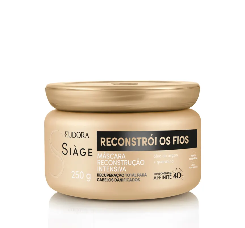 Máscara Capilar Siàge Reconstrói Os Fios 250g<br /> A Máscara Siàge Reconstrói os Fios age como um verdadeiro Creme de Reconstrução Capilar, entregando um tratamento intensivo para recuperar os cabelos de forma imediata. <br /> <br /> <br /> Sua fórmula enriquecida com Óleo de Argan e Queratina oferece o dobro de força para seus fios, combate as pontas duplas e garante cabelos hidratados e macios, desde o primeiro dia de uso do Creme de Reconstrução Capilar.<br /> <br /> <br /> Confira seus resultados:<br /> <br /> <br /> -Cabelos reconstruídos em um dia;<br /> <br /> <br /> -Acaba com a sensação de cabelos ásperos e porosos;<br /> <br /> <br /> -Cabelos até 2x mais resistentes à quebra;<br /> <br /> <br /> -Livre de pontas duplas;<br /> <br /> <br /> -Recuperação total de danos.<br /> <br /> <br /> A Máscara Capilar Reconstrói Os Fios garante recuperação completa para os fios danificados diariamente.<br /> <br /> <br /> SOBRE A LINHA<br /> <br /> <br /> Eudora Siàge uniu a força da natureza ao poder da ciência e criou a exclusiva biotecnologia Affinité 4D. Com inteligência detectora de danos, trata os fios até a camada mais profunda, mesmo após o enxágue. A linha Siàge Reconstrói os Fios conta com uma gama completa de produtos que entregam 6x mais força, combate as pontas duplas e quebradas e recupera 1 ano de danos em apenas duas semanas de tratamento. <br /> <br /> <br /> <br /> <br /> <br /> Nenhum produto Eudora é testado em animais, ou seja, este item possui selo Cruelty Free.