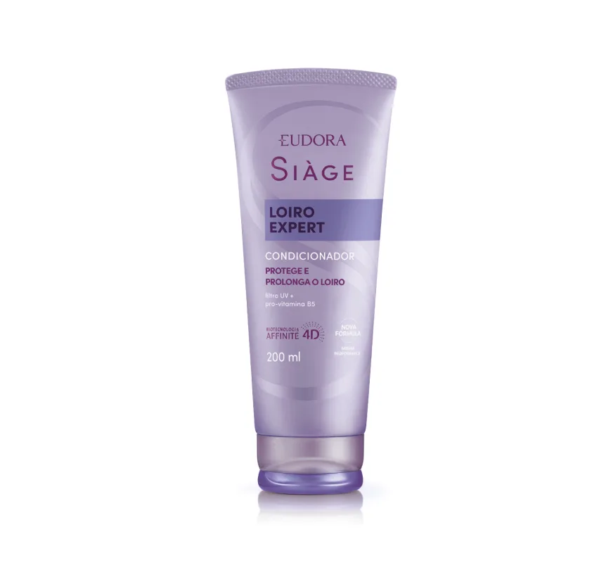 Condicionador Desamarelador Siàge Loiro Expert 250ml<br /> O Condicionador Desamarelador Siàge Loiro Expert entrega o melhor tratamento para seus fios descoloridos.<br /> <br /> Sua fórmula enriquecida com Filtro UV e Pro-Vitamina B5 protege os fios da exposição solar e hidrata intensamente os cabelos sem deixar que eles percam o movimento, garantindo madeixas leves, radiantes e bem cuidados por muito mais tempo.<br /> <br /> SOBRE A LINHA<br /> <br /> Uma linha completa de tratamento para quem desejar ter seus loiros iluminados e protegidos. Proporcionando mais brilho e proteção desde a primeira aplicação, Siàge oferece por meio do Loiro Expert uma cor intensa e radiante por muito mais tempo. Perfeita para cabelos com luzes, mechas ou tingidos, essa linha completa une alto poder antioxidante e hidratação para preservar a cor de cada um dos seus fios.<br /> <br /> Nenhum produto Eudora é testado em animais, ou seja, este item possui selo Cruelty Free.
