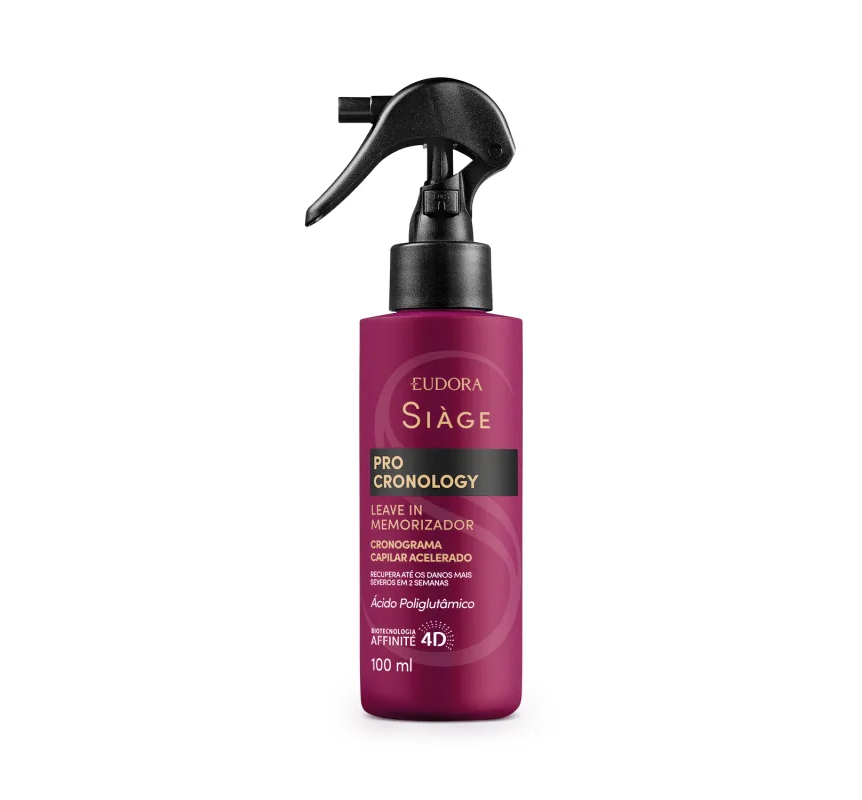Leave in Memorizador Siàge Pro Cronology 100ml<br /> Siàge Pro Cronology traz o cronograma capilar acelerado capaz de recuperar todos os tipos de danos em 2 semanas. A linha pausa a degradação e o desgaste do fio e recupera os danos mais severos em todos os tipos de cabelo. <br /> Toda a linha possui fórmulas enriquecidas com Ácido Poliglutâmico: ativo biotecnológico que auxilia no equilíbrio da umidade natural interna e externa dos fios, garantindo maciez, brilho e alta hidratação dos cabelos.<br /> O Leave in Memorizador Siàge Pro Cronology fixa o tratamento no fio mesmo após o enxágue e mantém seus cabelos tratados por mais tempo. Confira abaixo todos os benefícios do finalizador:<br /> -Garante redução de pontas duplas e triplas;<br /> -Maciez e brilho na 1ª aplicação;<br /> -Proteção térmica de até 230°;<br /> -Blinda o cabelo, protegendo do calor, dos raios solares e das agressões diárias;<br /> -Prolonga o efeito da reconstrução do fio mesmo depois do término do cronograma capilar.<br /> <br /> Ideal para uso contínuo, o Leave in Memorizador Siàge Pro Cronology auxilia na manutenção dos fios saudáveis e recuperados.<br /> Para garantir uma ação tão eficiente, a linha Siàge Pro Cronology age nas 3 etapas do cronograma proporcionando hidratação, nutrição com reposição de nutrientes essenciais e uma reconstrução poderosa que repara os danos.<br /> Além de ser vegano, este finalizador também possui fórmula sem parabenos, petrolatos ou corantes.<br /> Siàge Pro Cronology: cronograma capilar acelerado de 2 semanas que cabe na sua rotina!<br /> <br /> <br /> SOBRE SIÀGE<br /> Eudora Siàge uniu a força da natureza ao poder da ciência e criou a exclusiva biotecnologia Affinité 4D. Com inteligência detectora de danos, trata os fios até a camada mais profunda, mesmo após o enxágue. Siàge. Tecnologia para o seu melhor cabelo, todos os dias.<br /> Nenhum produto Eudora é testado em animais, ou seja, este item possui selo Cruelty Free.