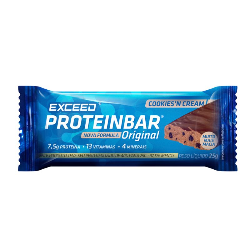 <h2 style="text-align: justify;"><strong>Exceed Proteinbar Original Cookies 25G Advanced Nutrition</strong></h2> <h2 style="text-align: justify;">A barra proteica <strong>Exceed Proteinbar Original</strong> sabor <strong>cookies</strong> foi elaborada com 7,5g de proteína. Sua nova fórmula contém 30% de proteínas provenientes do whey protein e colágeno hidrolisado, além de ser enriquecida com vitaminas e minerais, que promovem um produto de boa composição nutricional. Muito mais macia com o sabor e crocância irresistíveis de cookies.</h2> <h2 style="text-align: justify;"><strong>Sobre os ingredientes:</strong></h2> <h2 style="text-align: justify;"><strong>ALÉRGICOS: Contém derivados de leite e soja. Pode conter avelã, amendoim, castanha do Pará e derivados de ovo. Contém lactose.</strong><strong><br /></strong>Não contém glúten</h2> <h2 style="text-align: justify;"><strong>Sugestão de consumo:</strong></h2> <h2 style="text-align: justify;">Uma boa opção de snack proteico e saboroso. Prático para ser consumido no pós treino ou até mesmo em lanches intermediários em dias mais corridos. Pode te acompanhar em qualquer lugar.</h2> <h2 style="text-align: justify;"><strong>Motivos para escolher o produto:</strong></h2> <ul style="text-align: justify;"> <li> <h2>7,5g de proteína;</h2> </li> <li> <h2>Enriquecido com vitaminas e minerais;</h2> </li> <li> <h2>Nova fórmula, mais macia;</h2> </li> <li> <h2>Com adição de colágeno.</h2> </li> <li> <h2>Sem glúten.</h2> </li> </ul> <h2 style="text-align: justify;"><strong>A Marca</strong></h2> <h2 style="text-align: justify;">A Advanced Nutrition é uma empresa carioca que foi fundada em 1987. Sempre em busca de qualidade e inovação, se diferenciou no mercado por seus produtos desenvolvidos e fabricados somente com ingredientes de alta qualidade, sendo a primeira indústria de alimentos saudáveis do Brasil certificada em Boas Práticas de Fabricação (<em>GMP – Go</em><em>od Manufacturing Practices)</em>.</h2> <h2 style="text-align: justify;"> </h2>