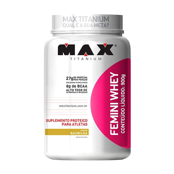 Informações técnicas do produto<br> O Femini Whey Sabor Baunilha, da Max Titanium é uma combinação de proteína do soro do leite concentrada e proteína isolada da soja, tendo 27 gramas de proteína por porção, junto com o sabor da baunilha.<br> <br> Além disso, o suplemento também contém um mix de vitaminas e minerais, boas quantidades de BCAAs e colágeno.<br> <br> Recomendação de consumo<br> Pode ser consumido em qualquer horário do dia conforme orientação do profissional.<br> <br> Misturar 1 ou 2 dose(s) em 200ml de água ou leite (desnatado de preferência).<br> <br> Informações sobre alergênicos<br> Contém derivados de leite e soja e pode conter derivados de ovo. Contém lactose. Não contém glúten.