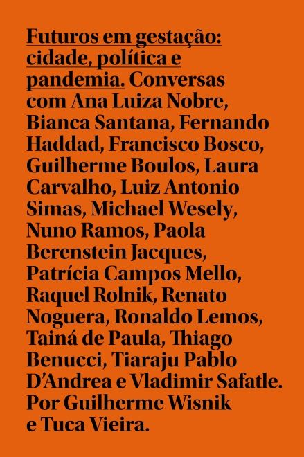 Nas dezoito conversas publicadas, Guilherme Wisnik conduz, em diálogo com os diversos autores, reflexões potentes para um mundo em crise. O livro conta com ensaio fotográfico inédito de Tuca Vieira realizado em São Paulo durante a pandemia de Covid-19.