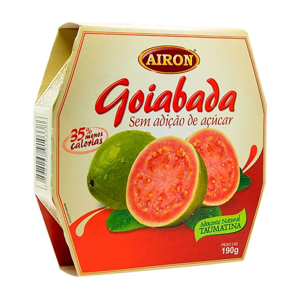 <br>_x000D_ A Goiabada, da Airon, é produzido com 73% de pura polpa de goiaba vermelha, ou seja, com redução de 35% menos calorias se comparado aos outros doces de goiabada tradicional. A goiabada é sem adição de açúcar e glúten, pode ser mantida em temperatura ambiente que continua saborosa e cremosa e também mantida sob refrigeração permanecendo com a consistência firme.<br>_x000D_ <br>_x000D_ Recomendação de consumo:<br>_x000D_ A sobremesa ideal para o seu dia-a-dia.<br>_x000D_ <br>_x000D_ Por que escolher esse produto?<br>_x000D_ Sem adição de açúcar<br>_x000D_ Não contém Glúten<br>_x000D_ 35% menos calorias<br>_x000D_ Adoçante natural: taumatina<br>_x000D_ Kosher<br>_x000D_ Pode ser mantida em temperatura ambiente ou sob refrigeração<br>_x000D_ Rigoroso controle de rastreabilidade e laudos fitossanitários<br>_x000D_ Sobre a marca:<br>_x000D_ A Airon, é uma empresa que surgiu da necessidade e dedicação da Família Ferro, que por sofrerem algumas restrições alimentares passaram a ter interesse em desenvolver doces que fossem saborosos e ao mesmo tempo isentos de ingredientes alergênicos. No ano de 2000 chegaram á indústria de alimentos com o objetivo de produzirem doces populares, saborosos e de qualidade direcionados principalmente as pessoas que possuem restrições alimentares. Atualmente, a linha de produtos vem crescendo com grandes diferenciais, sempre levando à mesa alimentos saudáveis e nutritivos, todos Zero Açúcar, Zero Glúten e Zero Lactose.