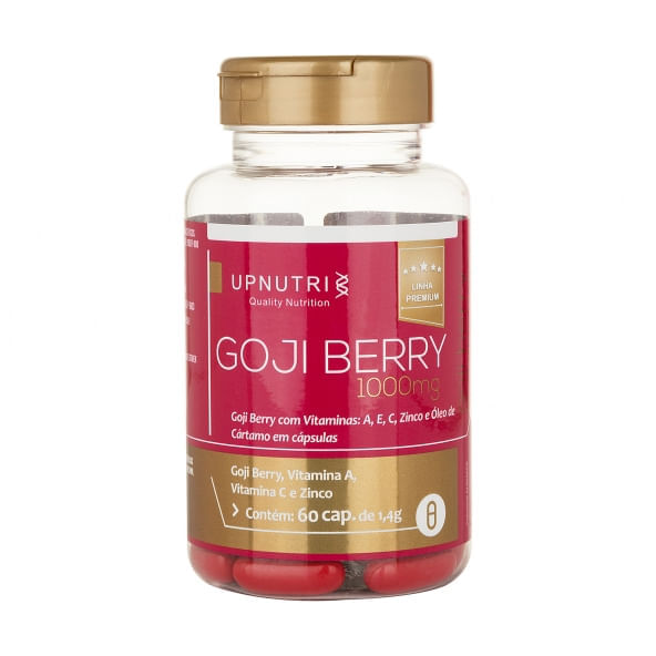 Informações técnicas do produto: <br> O Goji Berry, da Upnutri, possui 60 cápsulas, é um suplemento a base de goji berry, óleo de cártamo, com adição de vitamina A, E, C e minerais, como o zinco.<br> <br> Sobre os ingredientes:<br> Goji Berry: É uma fruta de origem asiática rica em nutrientes, como polifenóis, carotenoides (betacaroteno, licopeno, luteína e zeaxantina), vitamina C, vitamina B12, magnésio, selênio e zinco.<br> Óleo de Cártamo: As sementes de cártamo são ricas em um óleo no qual predominam ácidos graxos do tipo mono e poli-insaturados, sendo composto principalmente pelo ácido oleico, ômega 9 e ácido linoleico, ômega 6.<br> Recomendação de consumo:<br> Ingerir 2 (duas) cápsulas ao dia.<br> <br> Por que escolher esse produto?<br> Contém 60 cápsulas de 1,4g<br> Linha Premiun<br> Não contém glúten<br> Isento de lactose<br> Sem adoçantes e aromatizantes artificiais<br> Livre de conservantes<br> Sem açúcar<br> Sobre a marca:<br> A Upnutri, é uma Indústria e Laboratório de Produtos Nutracêuticos que teve início em 2010 com o objetivo de aliar beleza e qualidade a sua linha de produtos, e poder se tornar uma das maiores indústrias do seguimento nutracêutico. A empresa possui compromisso com o respeito, qualidade e inovação. Conta com profissionais e equipamentos, com atendimento rápido e eficaz, seguindo todas normas de segurança e POP (Procedimento operacional de Produção).