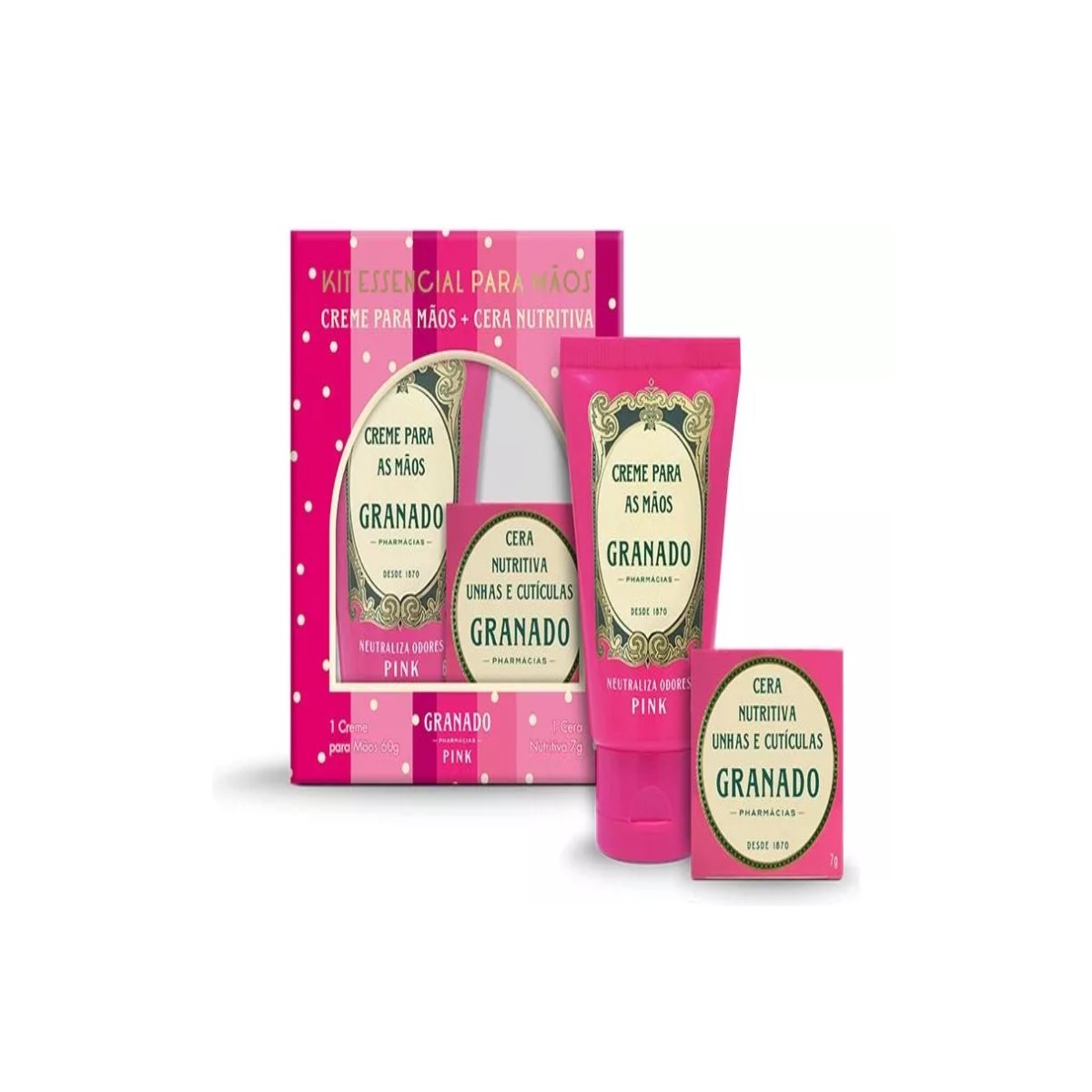 Creme de Mãos 60g:<br /> <br /> O Creme para Mãos Granado Pink é formulado com ativos vegetais hidratantes dos óleos de arroz, maracujá e açaí, que hidratam suavemente e criam uma camada protetora na pele.<br /> <br /> Dessa forma, mantém o equilíbrio hídrico na região das mãos e evita o ressecamento, ideal para mantê-las sempre macias e bem cuidadas.<br /> <br /> Granado Pink ainda possui ação antiodor, eliminando o mau cheiro que pode surgir pelo cigarro, condimentos e alimentos em geral. Use todos os dias, sempre que quiser.<br /> <br /> Cera Nutritiva 7g:<br /> <br /> A Cera Nutritiva Granado Pink Unhas e Cutículas foi desenvolvida para fortalecer as unhas e a região delicada das cutículas. Enriquecida com ceras e óleos vegetais, hidrata, nutre, dá brilho e força para as unhas, proporcionando um aspecto saudável para as mãos. A Cera Nutritiva Unhas e Cutículas da Granado é livre de ingredientes de origem animal, corantes e parabenos. Para uso diário.<br /> <br /> Principais ativos<br /> Cera Vegetal de Cereais, Leite de Aveia e Silicones: hidratam e nutrem intensivamente, deixando unhas e cutículas com um toque macio, suave e aspecto saudável.<br /> <br /> Benefícios e diferenciais do kit Granado Pink Essencial Mãos 2023<br /> Creme de Mãos 60g<br /> Textura leve.<br /> Rápida absorção.<br /> Livre de parabenos.<br /> Não contém ingredientes de origem animal.<br /> Especialmente indicado para mãos ressecadas e ásperas.<br /> Cera Nutritiva 7g<br /> Hidratante específico para unhas e cutículas.<br /> Dá brilho e fortalece as unhas.<br /> Fragrância delicada.<br /> Com base vegetal, não possui gordura animal.<br /> Sem parabenos e corantes.<br /> Como usar o kit Granado Pink Essencial Mãos 2023?<br /> Creme de Mãos 60g<br /> Use o seu Creme para Mãos Pink quantas vezes desejar todos os dias. Aplique uma pequena quantidade no topo das mãos e massageie suavemente por toda mão e dedos até que o creme seja absorvido por completo.<br /> <br /> O creme também pode ser usado nas regiões de maior ressecamento, como cotovelos, joelhos e pés – principalmente nos calcanhares – para um reforço na hidratação diária do corpo.<br /> <br /> Cera Nutritiva 7g<br /> Espalhar Granado Pink Unhas e Cutículas uniformemente na região das unhas e cutículas até completa absorção. Usar diariamente, duas a três vezes ao dia.