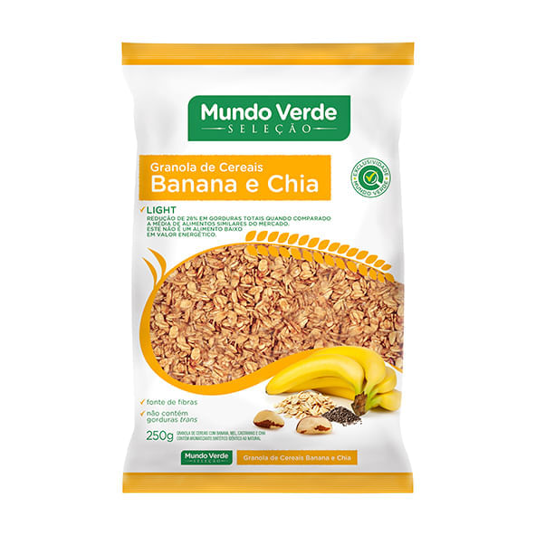 Informações técnicas do produto:<br> A Granola de Banana e Chia Light Mundo Verde Seleção é um produto feito com cereais integrais crocantes. Sua versão light proporciona menor teor de gordura quando comparada a outros produtos similares.<br> <br> Gostosa, é fonte de fibras e pode ser consumida como acompanhamento de iogurtes, frutas e também como ingrediente de receitas.<br> <br> Recomendação de consumo:<br> Pode ser consumida no café da manhã e como acompanhamento dos lanches entre as refeições. É ideal consumi-la com iogurtes, frutas, açaí e ingrediente de receitas, como bolos, por exemplo. <br> <br> Informações sobre alergênicos:<br> Contém glúten, aveia e derivados, derivados de trigo, derivados de cevada, castanha-de-caju, castanha-do-pará e derivados de soja. Pode conter leite e amendoim.<br> <br> Motivos para escolher esse produto?<br> Fonte de fibras<br> Baixo em gorduras saturadas<br> Cereais integrais<br> Não contém colesterol e gorduras trans<br> Sabor banana e chia<br> Informações sobre a marca:<br> A Mundo Verde Seleção é uma linha de produtos para quem quer ter uma vida mais saudável e gostosa. A marca quer ajudar a colocar essas escolhas em prática. A paixão e conhecimento pelos alimentos, nutrientes, aromas e sabores permitem a seleção das melhores opções saudáveis para qualquer ocasião. Conheça a linha completa Mundo Verde Seleção, com inúmeros produtos saudáveis e gostosos para facilitar seu dia a dia.