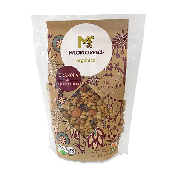 <p>A Granola de açúcar de coco sem glúten orgânico, da Monama é um produto que pode ser consumido com qualquer preparação. Feito com aveia, açúcar de coco, amêndoas, castanha do pará e nibs de cacau. Os alimentos orgânicos visam a qualidade de vida e sustentabilidade, desse modo não utilizam agrotóxicos, ou outros componentes químicos que possam trazer algum dano à saúde.</p>