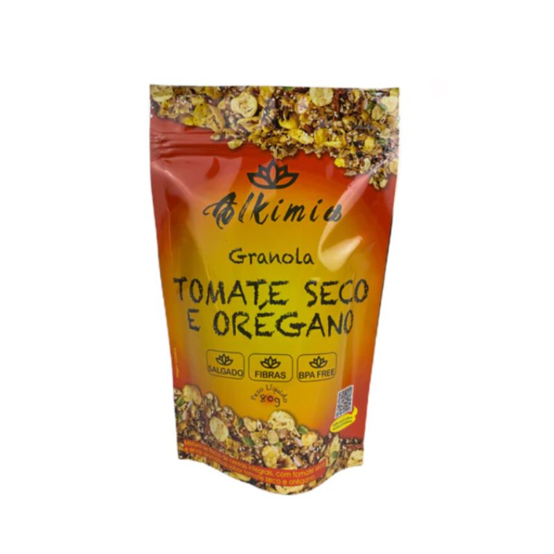 <h2>Granola Premium Artesanal de Tomate seco e Orégano 80g</h2> <p>A <strong>Granola Premium Artesanal salgada sabor tomate seco e orégano Alkimia</strong>, é<br />elaborada com semente de girassol, tomate seco, semente de abóbora, chia, linhaça,<br />gergelim preto, gergelim branco, alho em pó e orégano, ingredientes 100% naturais e<br />saudáveis, com uma execução que mimetiza o artesanal.</p> <h2>Sugestão de consumo:</h2> <p>Consuma uma porção que pode ser adicionada a saladas, receitas, pães, tortas e lanches.</p> <h2>Motivos para escolher o produto:</h2> <p style="padding-left: 40px;">● Seleção de ingredientes nobres;<br />● Alto aporte de fibras;<br />● Vegano;<br />● Sem corantes, conservantes e aromatizantes artificiais.</p> <h2>A Marca</h2> <p>O principal objetivo da Alkimia é agregar mais qualidade de vida aos nossos clientes,<br />proporcionando-lhes um dia a dia muito mais agradável. Possuem uma produção é baseada<br />em granolas, snacks e chips orgânicos assados, 100% artesanais e livres de conservantes<br />e corantes.</p>