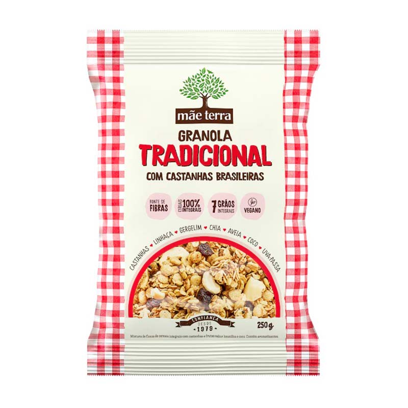 <p>Informações técnicas do produto:<br>Granola Tradicional, da Mãe Terra é elaborada com ingredientes integrais e pedaços de frutas, sendo uma ótima opção para complementar os lanches intermediários. Não possui adição de açúcar refinado e gordura trans, sendo 100% natural. <br><br>Por que escolher esse produto?<br>Integral<br>Com castanhas<br>Baixo teor de sódio<br>Fonte de fibras<br>Recomendação de consumo:<br>Pode ser adicionado em frutas, açaí ou conforme preferir. <br><br>Sobre a marca: <br>A Mãe Terra acredita que uma alimentação saudável, é composta por alimentos mais naturais e integrais, por isso os produtos são feitos com ingredientes que fazem bem para o corpo, não tendo adição de ingredientes artificiais. Atualmente é líder no segmento de alimentos naturais e orgânicos no Brasil.</p>