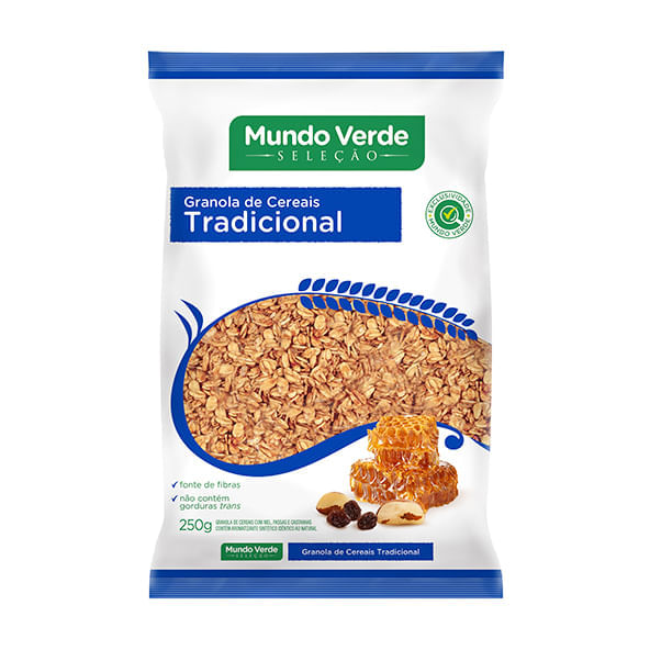 Informações técnicas do produto:<br> A Granola Tradicional Mundo Verde Seleção é feita com cereais integrais crocantes e é fonte de fibras. Além de deliciosa, não contém colesterol e gorduras trans, e pode ser consumida como acompanhamento de iogurtes, frutas e também como ingrediente de receitas.<br> Recomendações para o consumo:<br> Pode ser consumida no café da manhã e como acompanhamento dos lanches entre as refeições. É ideal consumi-la com iogurtes, frutas, açaí e ingrediente de receitas, como bolos, por exemplo. <br> Informações sobre alergênicos:<br> Contém glúten, aveia e derivados, derivados de trigo, derivados de cevada, castanha-de-caju, castanha-do-pará e derivados de soja. Pode conter leite, e amendoim.<br> Motivos para escolher esse produto?<br> Fonte de fibras<br> Baixo em gorduras saturadas<br> Cereais integrais<br> Não contém colesterol e gorduras trans<br> Sabor tradicional<br> Com mel<br> Informações sobre a marca:<br> A Mundo Verde Seleção é uma linha de produtos para quem quer ter uma vida mais saudável e gostosa. A marca quer ajudar a colocar essas escolhas em prática. A paixão e conhecimento pelos alimentos, nutrientes, aromas e sabores permitem a seleção das melhores opções saudáveis para qualquer ocasião. Conheça a linha completa Mundo Verde Seleção, com inúmeros produtos saudáveis e gostosos para facilitar seu dia a dia.<br>