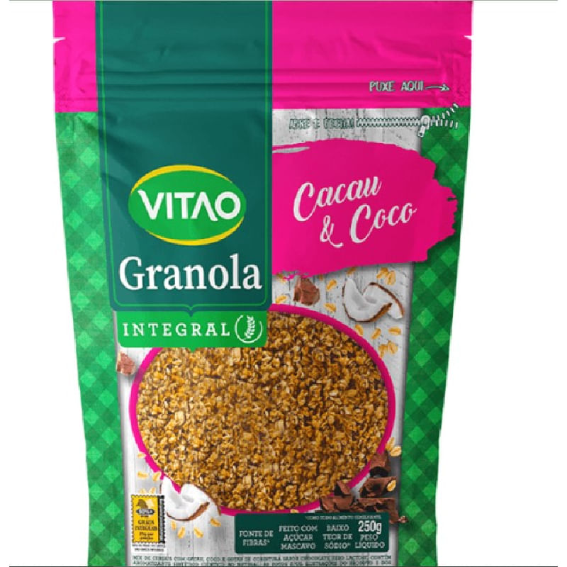 <p dir="ltr">A <strong>Granola Tradicional da Vitao</strong> vem em embalagem com <strong>250g</strong>, é vegana e conta com ingredientes integrais, sua composição contém <strong>cacau e coco</strong>, que proporciona uma explosão de sabores junto de uma textura crocante.</p> <p> </p> <h2 dir="ltr">Sobre os ingredientes:</h2> <p dir="ltr"><strong>Aveia em flocos:</strong> é naturalmente fonte de fibras alimentares.</p> <p dir="ltr"><strong>Linhaça marrom:</strong> semente fonte de gorduras boas, como ômega 3 e 6.</p> <p dir="ltr"><strong>Cacau em pó:</strong> ingrediente rico em antioxidantes.</p> <p> </p> <h2 dir="ltr">Sugestão de consumo:</h2> <p dir="ltr">A granola pode ser adicionada a frutas, iogurtes e saladas para trazer crocância ao prato.</p> <p> </p> <h2 dir="ltr">Motivos para escolher o produto:</h2> <ul> <li dir="ltr"> <p dir="ltr">Sem lactose;</p> </li> <li dir="ltr"> <p dir="ltr">Fonte de fibras;</p> </li> <li dir="ltr"> <p dir="ltr">Opção para vegetarianos e veganos;</p> </li> <li dir="ltr"> <p dir="ltr">Feita com ingredientes integrais.</p> </li> </ul> <h2 dir="ltr">A Marca:</h2> <p dir="ltr">Buscando ser referência no mercado de alimentos saudáveis, a Vitao Alimentos foi fundada em 1988. Inicialmente a empresa contava com um portfólio voltado a dieta macrobiótica, e ao longo dos anos foi ampliando a oferta de produtos, seguindo as tendências do segmento de alimentos saudáveis, e atualmente possuem uma linha completa, com opções sem adição de açúcar e sem glúten. </p>