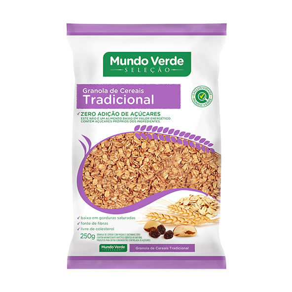 Informações técnicas:<br> A Granola Tradicional Zero Adição de Açúcares Mundo verde Seleção é produzida com uma mistura de cereais integrais e crocantes. É fonte de fibras e possui baixo teor de gorduras.<br> <br> Recomendações para consumo:<br> Pode ser consumida pura, mas também com frutas, iogurtes, bebidas, como cobertura de sobremesas ou no preparo de bolos. Opção para o café da manhã ou lanche da tarde.<br> <br> Informações sobre alergênicos:<br> Contém aveia e derivado, derivados de trigo, derivados de cevada, castanha de caju e castanha do Pará. Pode conter leite e amendoim.<br> <br> Motivos para escolher esse produto?<br> Sem adição de açúcar<br> Cereais Integrais<br> Fonte de fibras<br> Sem colesterol e gordura trans<br> Informações sobre a marca:<br> A Mundo Verde Seleção é uma linha de produtos para quem quer ter uma vida mais saudável e gostosa. A marca quer ajudar a colocar essas escolhas em prática. A paixão e conhecimento pelos alimentos, nutrientes, aromas e sabores permitem a seleção das melhores opções saudáveis para qualquer ocasião. Conheça a linha completa Mundo Verde Seleção, com inúmeros produtos saudáveis e gostosos para facilitar seu dia a dia.