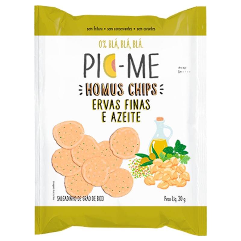 O Homus Chips Azeite e Ervas, da Pic-me é um snack elaborado com grão de bico em formato de chips, temperado com cúrcuma e pimenta preta que fornece 3,2g de proteína na porção. Uma opção crocante e livre de fritura. Não contém gordura trans, conservantes artificiais, ovos ou açúcar.